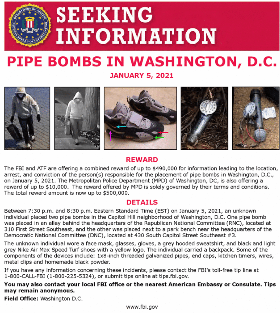 2. FBI at https://www.fbi.gov/wanted/capitol-violence including a $500,000 reward for the pipe bomb suspect.