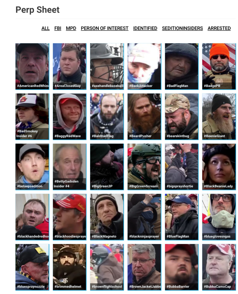 - Sedition Hunters at https://seditionhunters.org/. They post updated collages on Twitter which make it easy to follow who still needs to be identified like this one below
