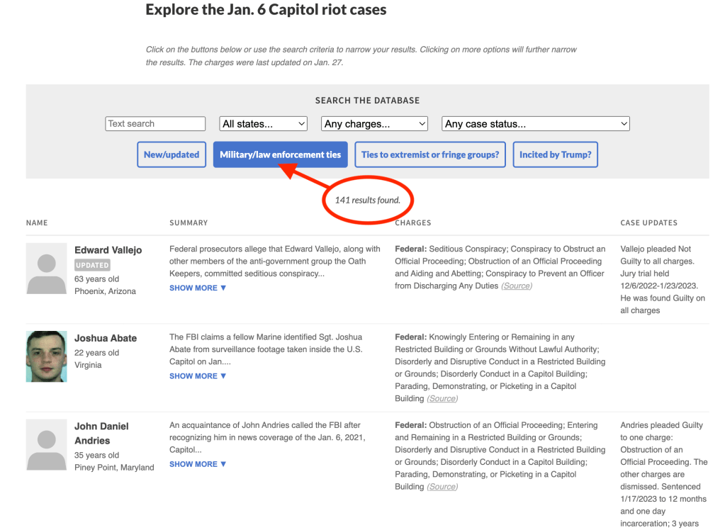 2. NPR: https://www.npr.org/2021/02/09/965472049/the-capitol-siege-the-arrested-and-their-stories. This database stays up-to-date, marks new arrests with red notice box and is searchable by state, keywords and/or characteristic. For example, the screenshot below is a search for “Military/Law Enforcement Ties” yielding 141 results on 01/27/2023.