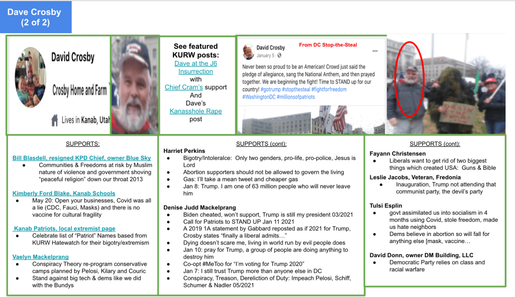 I resided in the Kanab, Utah area from 2009 throughout 2020. I created KURW following the January 6, 2021 attempt by domestic extremists to stop the certification of the election which nearly a dozen Kanab area residents participated and were encouraged by the Kanab City Police Chief & fellow law enforcement. I resided most of my life in rural America and was raised in a large, far-right family. Studies show new trends in extremist characteristics, feelings of fear/anger/betrayal, an increase in social media recruitment and incitement, and radicalization as quickly as six months. Concerned residents of the area had collected evidence of public activity beginning with the six months of weekly Black Lives Matter and All Lives Matter and MAGA events in Kanab. That documentation, public posts on social media, contribution from community members and outside organizations were compiled to create KURW Hatewatch because I feel like that is the best way that I can address the call for awareness to the threat of extremism.