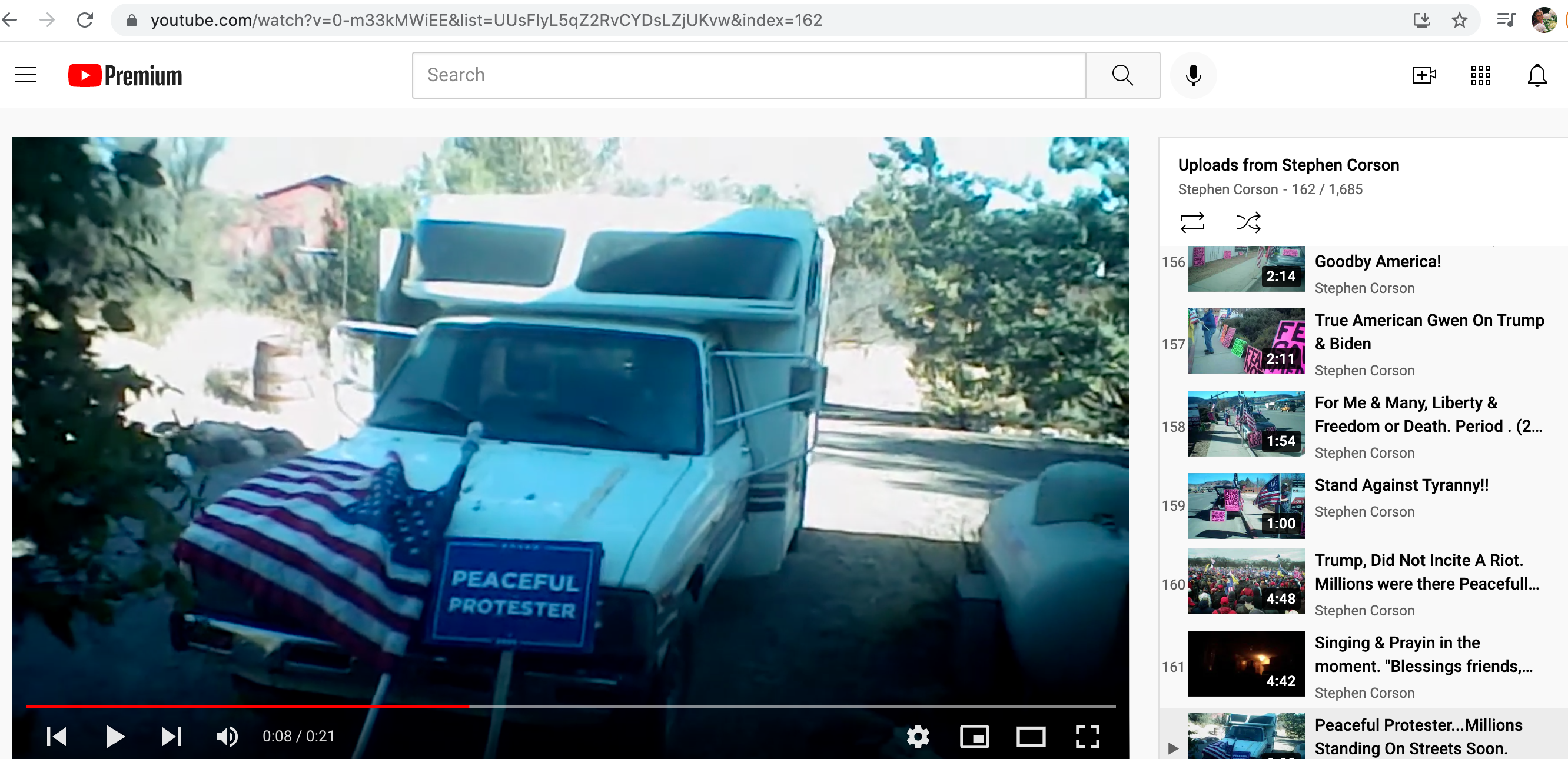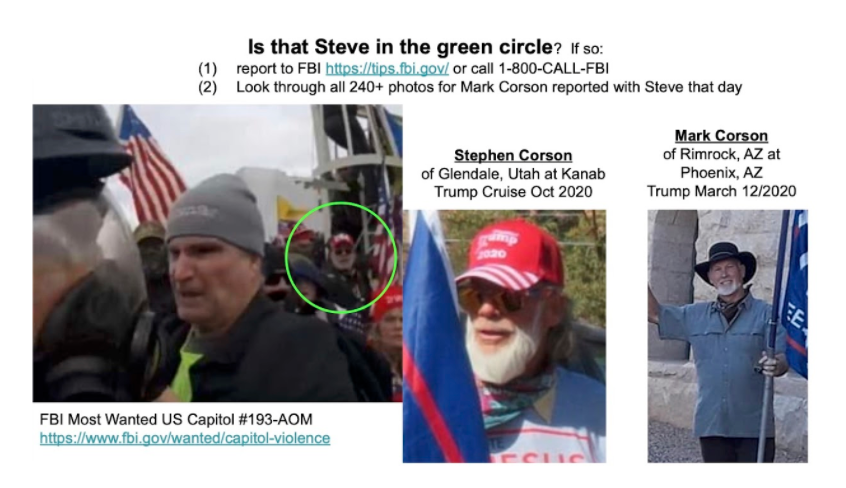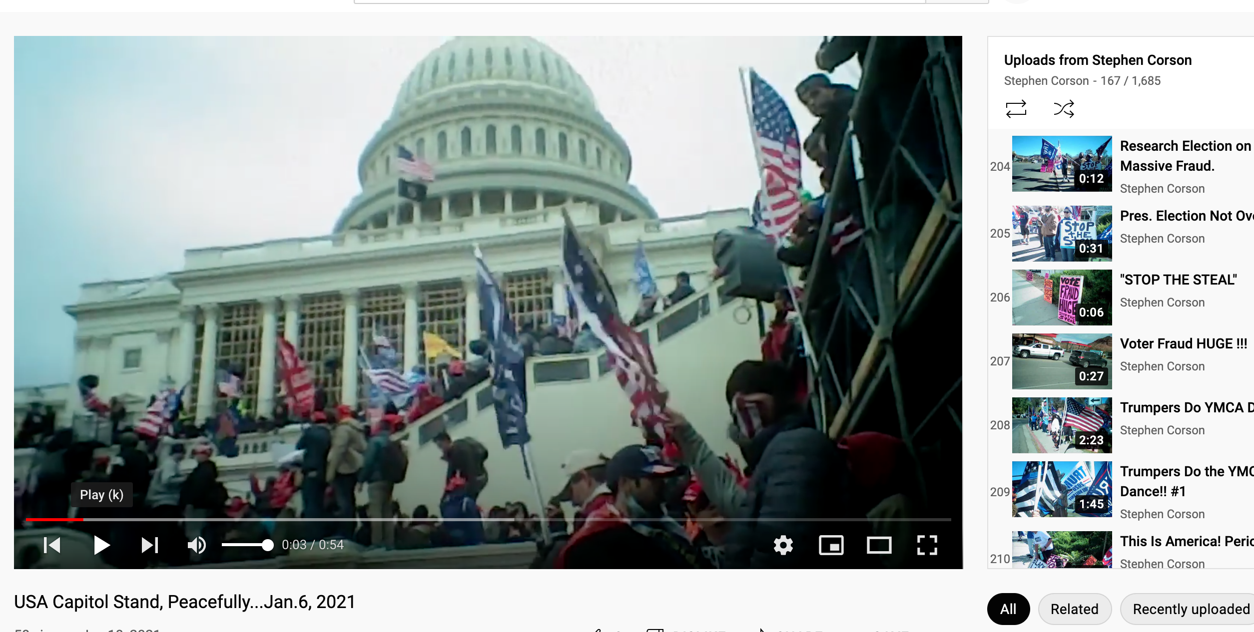 Social media posts on FB profile Grace Ann Christian and Jeannine Corson report that Stephen Corson and his brother Mark Corson were at the Capitol. Steve posted some of these videdos on his YouTube channel https://www.youtube.com/playlist?list=UUsFlyL5qZ2RvCYDsLZjUKvw, but none of “the attack” mentioned on Facebook.