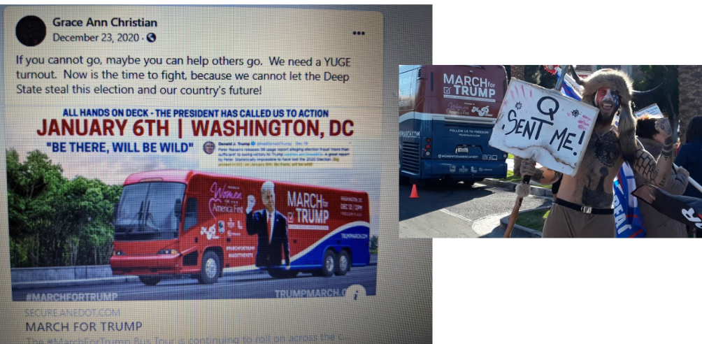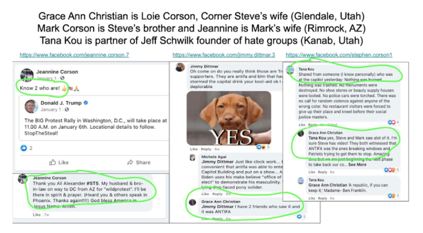 Grace Ann Christian is actually Lois Corson, wife of Stephen. Jeannine Corson is wife of Mark Corson of Rimrock, AZ. All four attended rallies in Kanab and Arizona (one with QAnon Shaman). Lois Corson advertised a bus for Stop-the-Steal at DC.