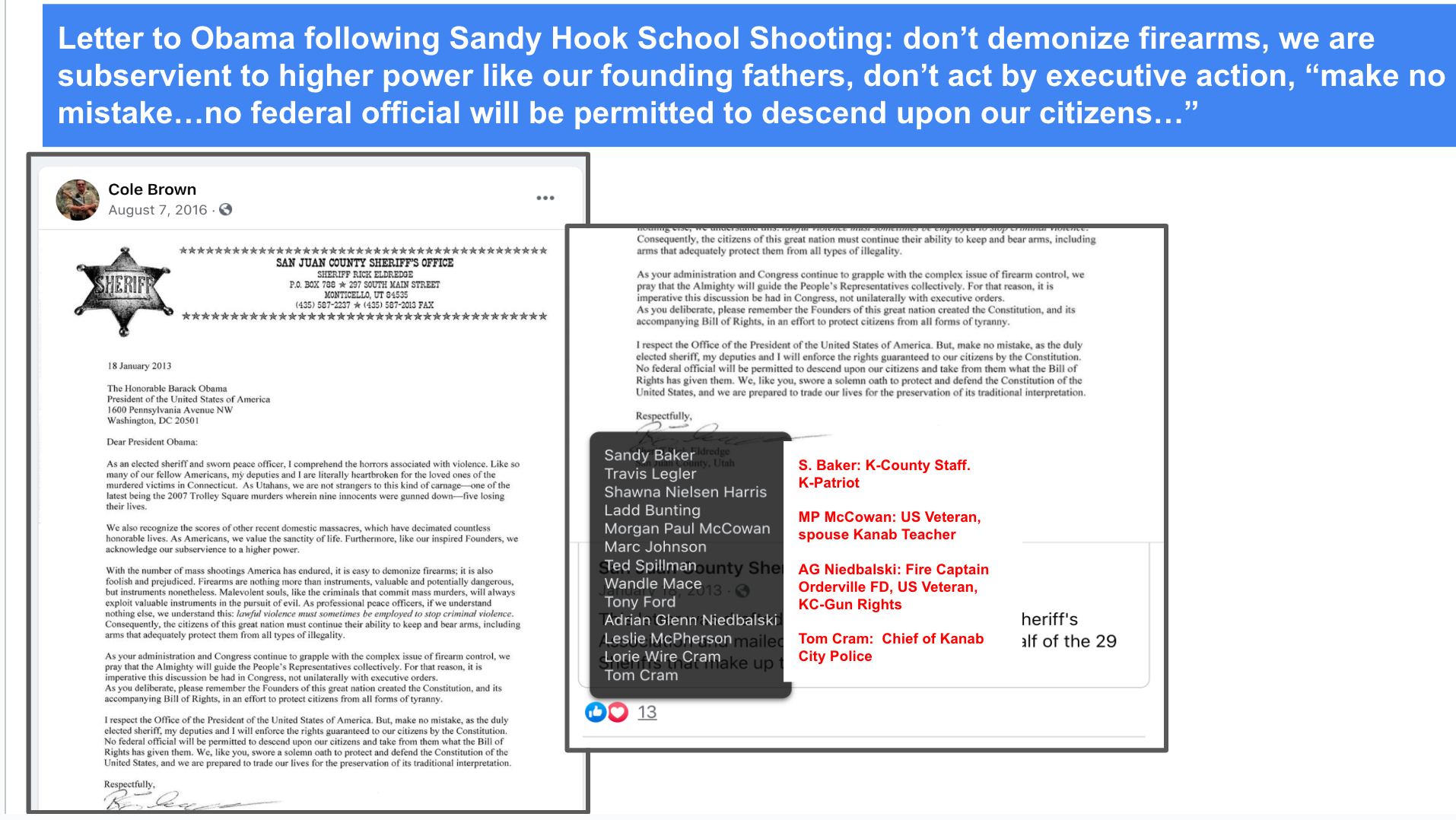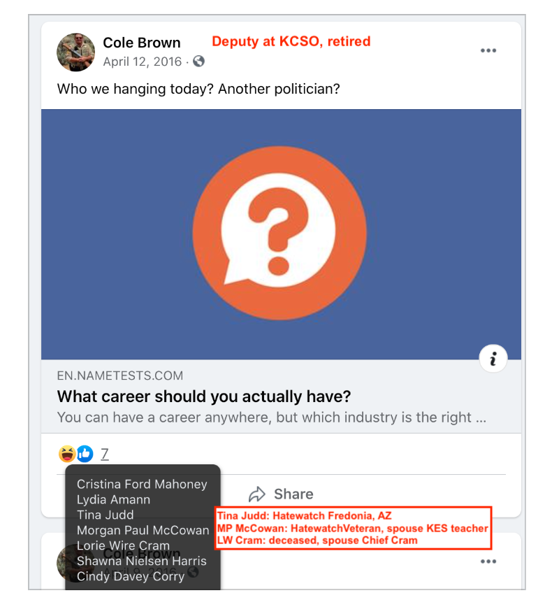 Toggle left & right through these 18 screenshots, most include evidence of extremism and bigotry and a few do not. Aside from one informational comment on extremist page Kanab Patriots, Cole mostly uses his personal FB page and pages of his friends.