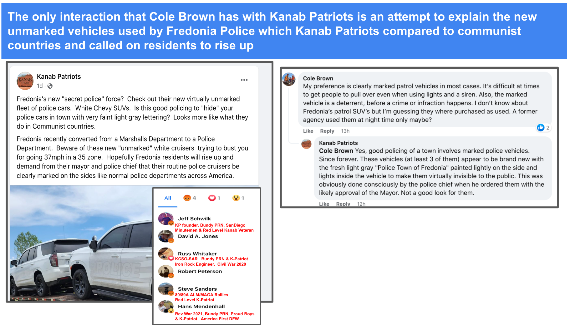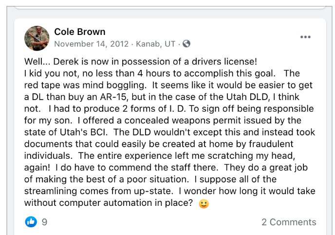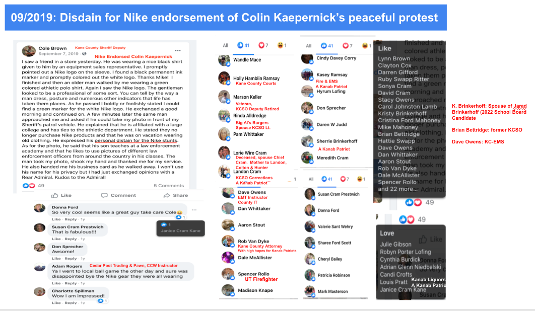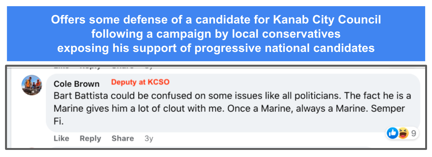 Cole Brown retired from Kane County Sheriff’s Office 2023. He is included in KURW post Love it or Leave Series, Part 1: “Leave Kanab, Don’t Come Here” for his comment “why they [BLM 2020 protester] just don’t move to a country of their liking.”