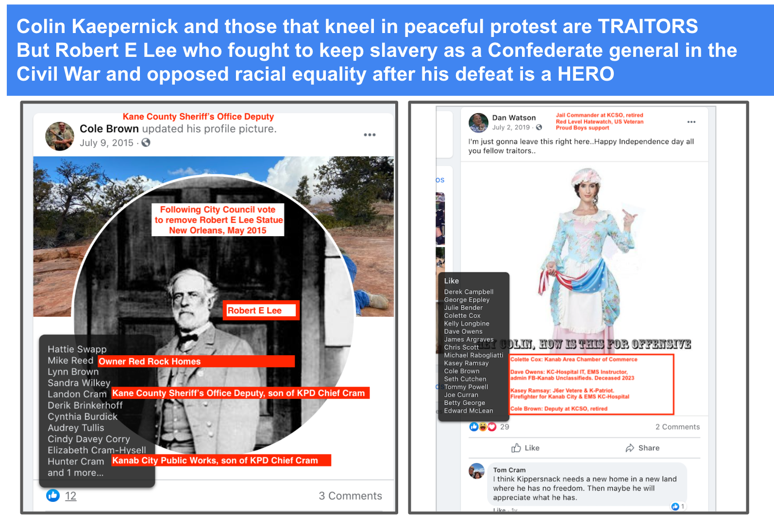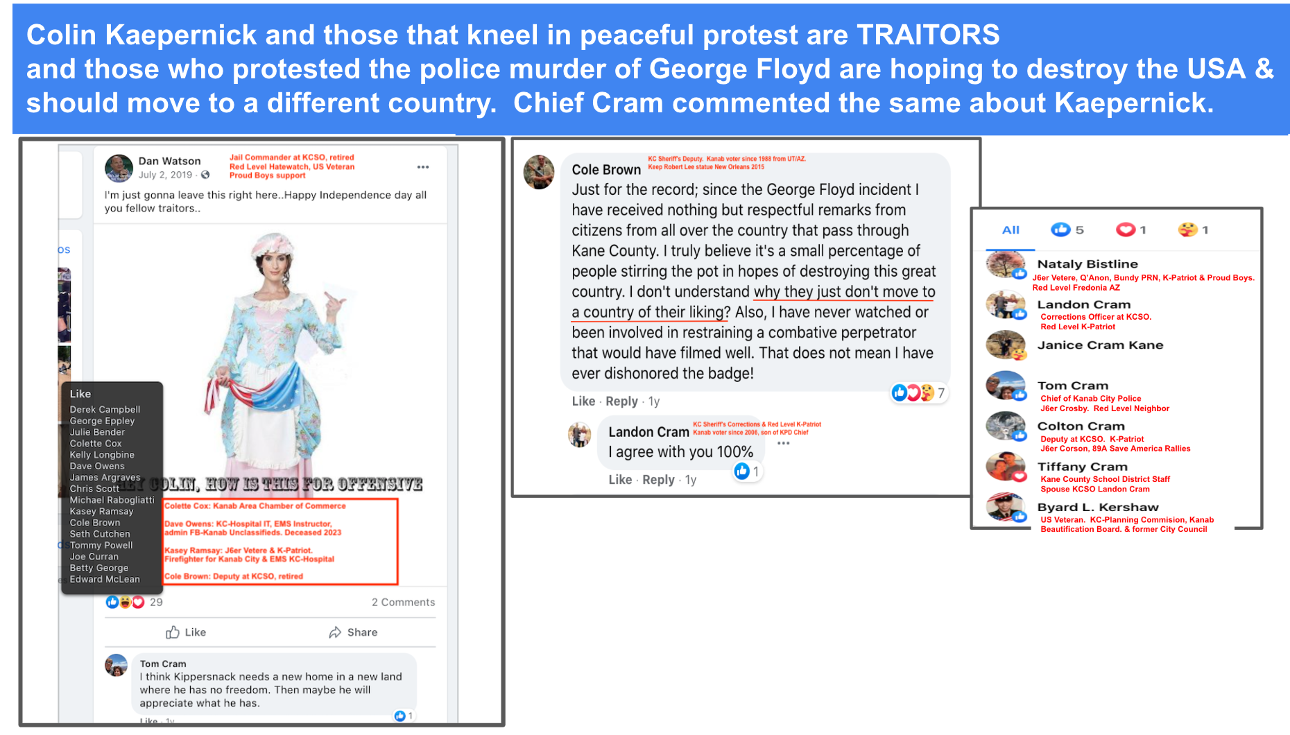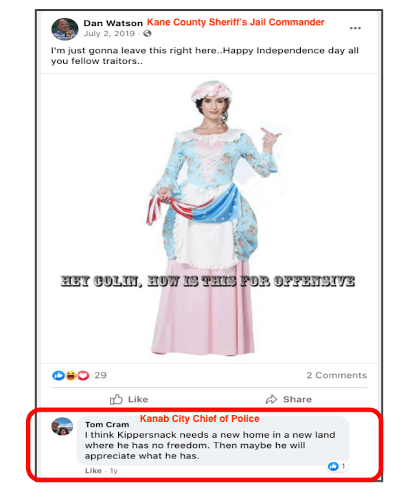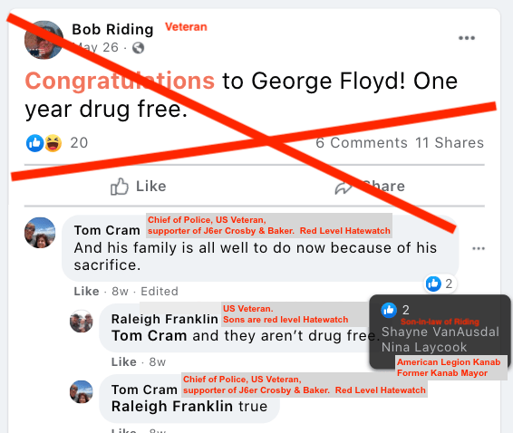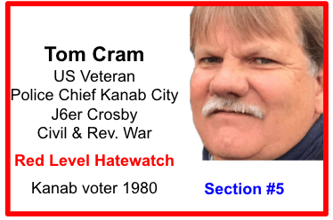 The level & content of Chief Cram’s engagement on social media combined with his status designates him as Red Level Hatewatch. Tom cheered on Insurrectionists from Kanab Area, encourages calls to fight, desire for peaceful protesters to be exiled and lose their freedom, and posts disregard for human life.