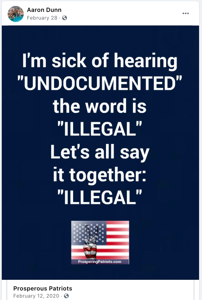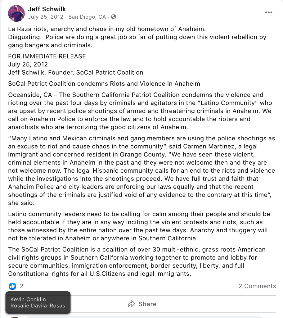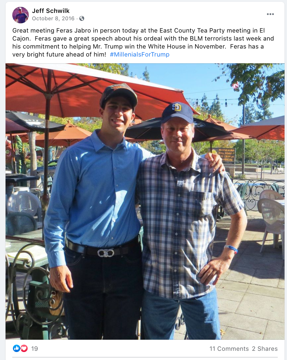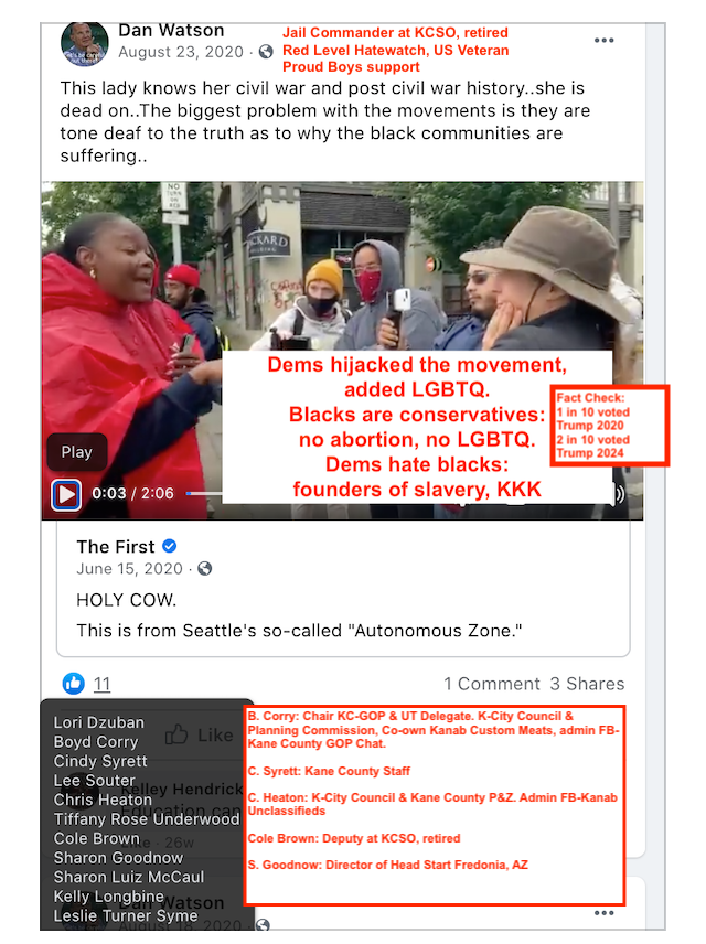 - Schwilk, Social Media Extremism using PERSONAL FB profile: Racism (black Americans, Latinos, Syrians), Conspiracy Theories (Vegas shooting, Antifa, protests, gas prices, taking freedoms, immigrant voting), False Narratives (anything deemed “Left”), anti-government & doom of America, berates people on local FB groups like Kanab Fredonia Rant & Rave, anti-women. violence (run over protesters) and the “Move back to where you came from” line. His worst two are the #HimToo and the comment”blacky put a bullet in your head”.