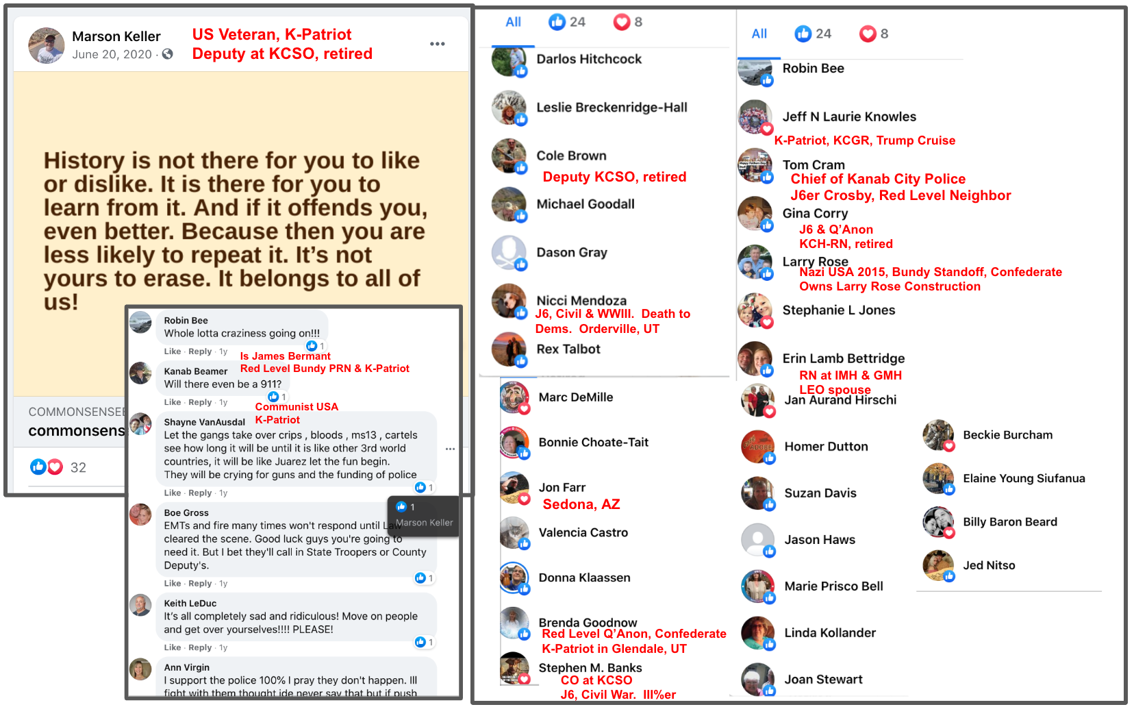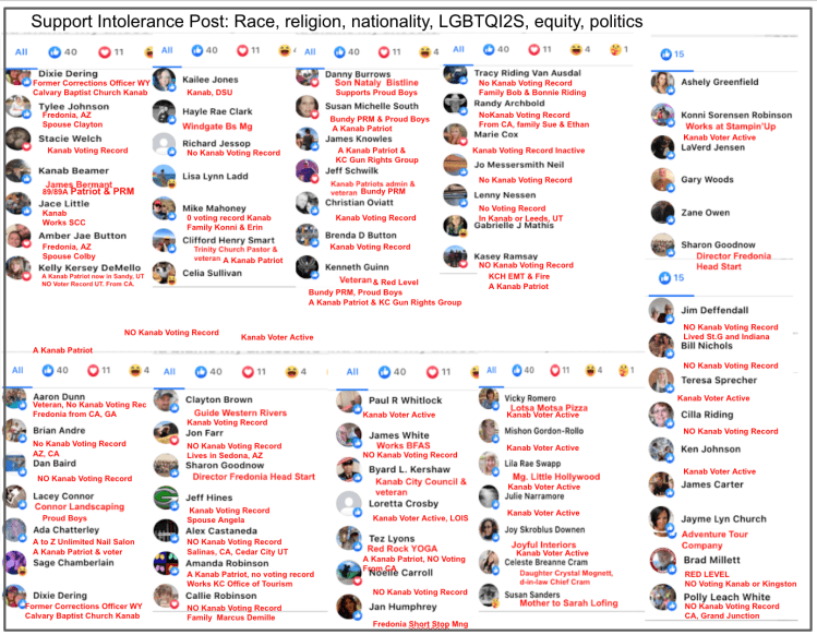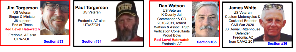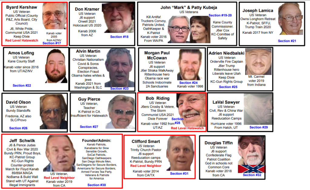 These 36 veterans in the Kanab area post/encourage and/or personally engage in extremism & bigotry publicly. This post is organized so that each veteran’s evidence is displayed in a dedicated section, numbered (indicated by “section #” on image) & in alphabetical order corresponding to the thumbnail photos below. Those 36 sections are preceded by a background section for both local and national context.