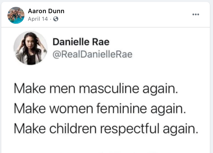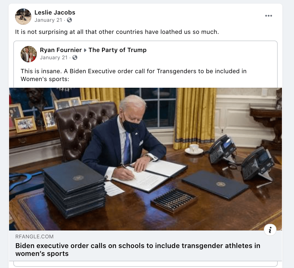 Posts after J6: Election fraud, BLM 2020 worse than J6, False flag & Trump did not incite, transphobia, homophobia, immigrants, abortion, 2A, 1A, christofascism, covid disinformation & defiance, don’t move here & change us, hate USA then leave, education produced everything about the Nazi regime, Canada is Cuba 2022, Marxist Trudeaux, CA Trucker/Freedom Convoy, Public schools indoctrinate, Trump is President 2022, anti-government, oppose cancel culture, Protect Dixie St. George, Fauci Fraud, Rittenhouse hero