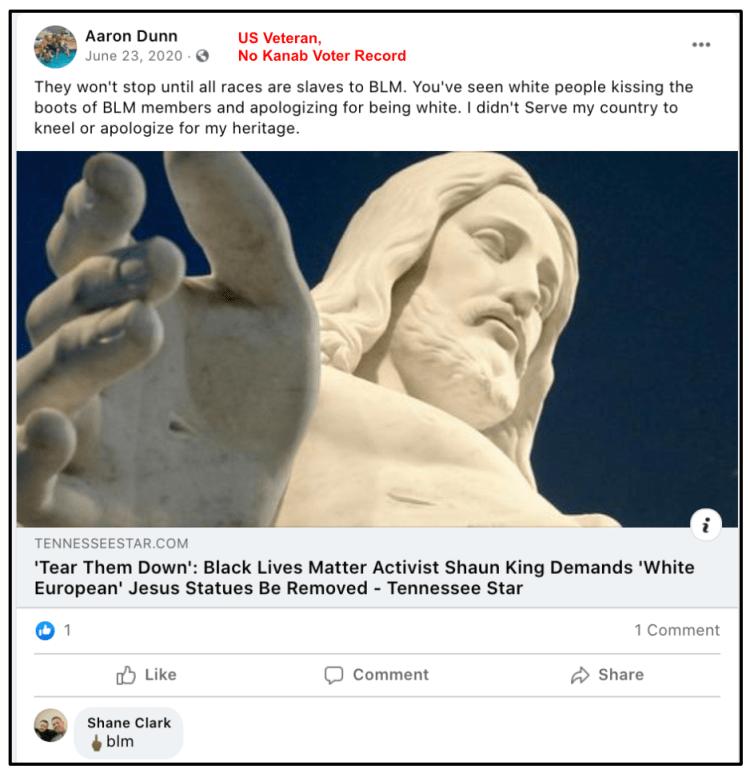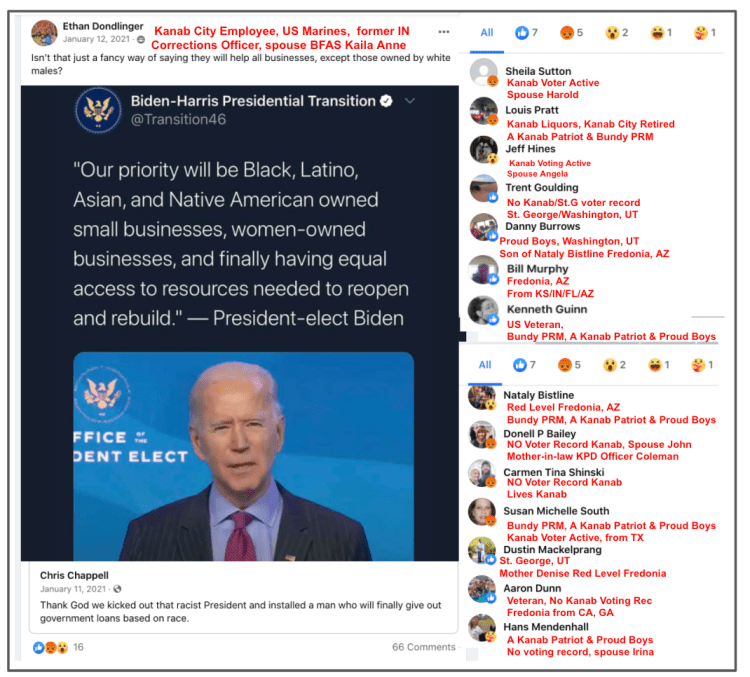 Toggle (arrows right/left of images) through these seven slides of evidence of Kanab Veteran’s counter-protesting social justice, supporting Stop-the-Steal and using social media groups for radicalization. Others use their personal page or local FB groups and that evidence is in their section following this.