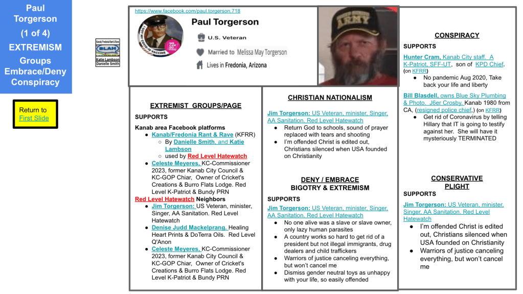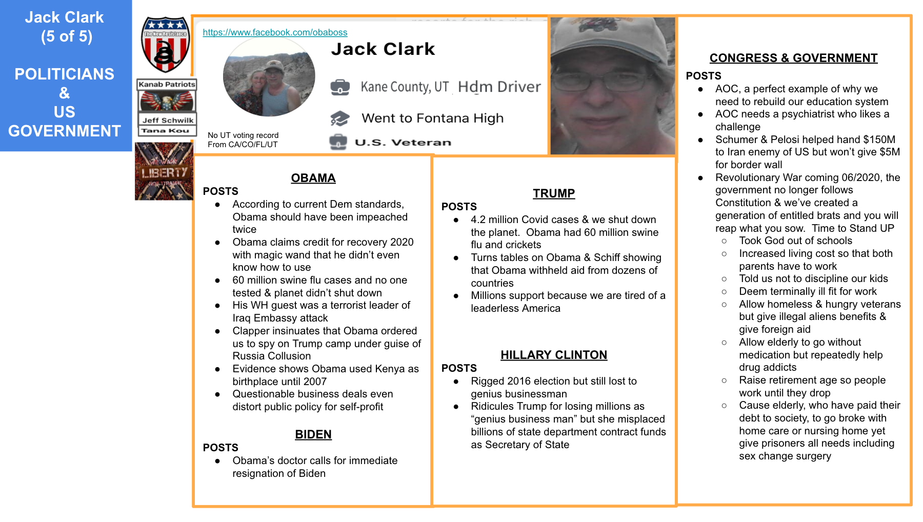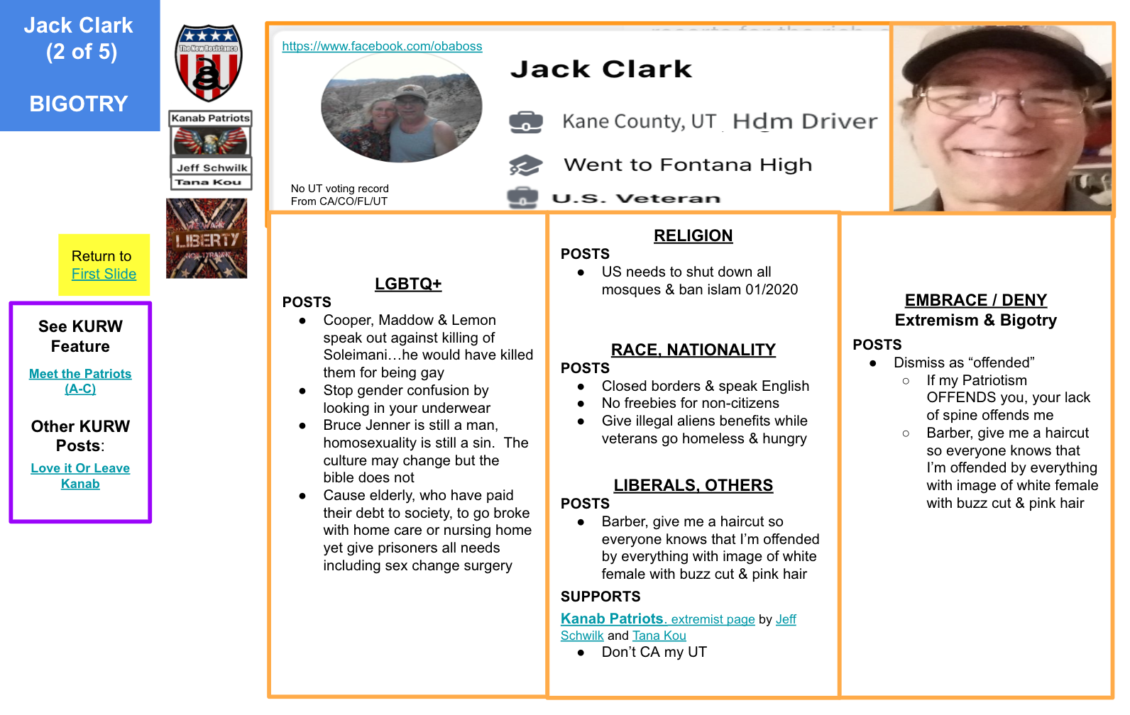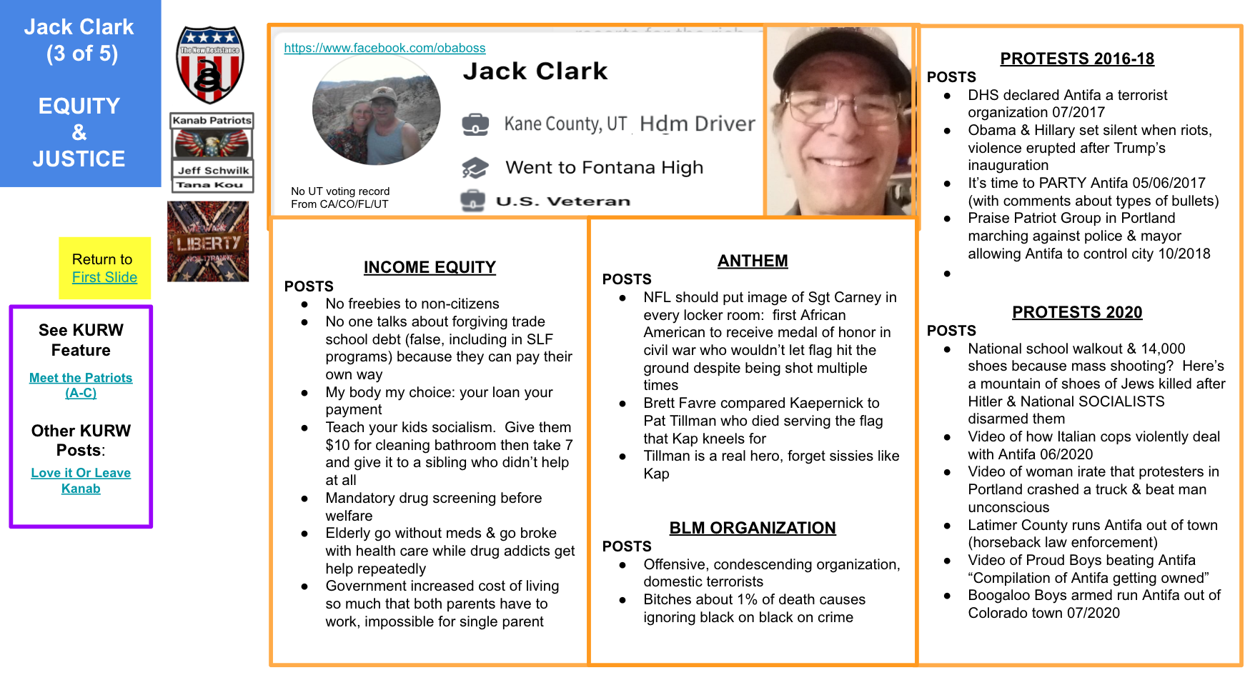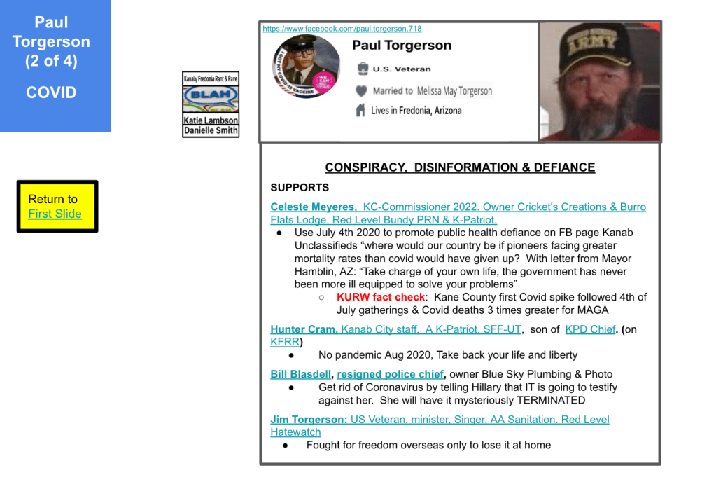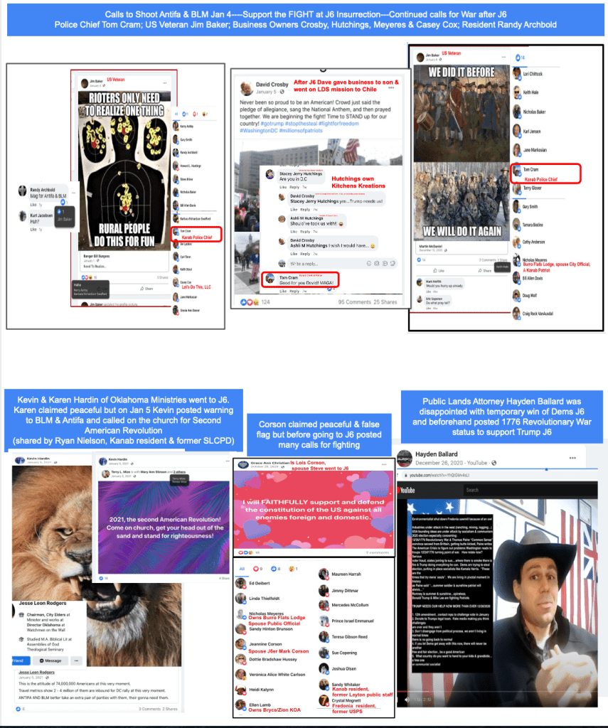 Jack uses his personal FB page and Kanab Patriots FB page. Toggle left & right through the 5 slides of evidence below and KURW post Meet the Kanab Patriots: last names A,B, C to use clickable Google Slides from fellow “Patriots”