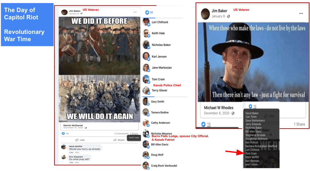 The content and volume of public posts, mostly on his personal FB page by Jim resulted in the Red Level Hatewatch designation. He supported the J6 Insurrection claiming a “planned destruction of America” , Revolutionary War and in August 2021 stated “just say when America, veterans are ready to pounce.” These calls to fight were encouraged by fellow veteran and Kanab Police Chief Tom Cram, including support of Insurrectionists from Kanab Area.