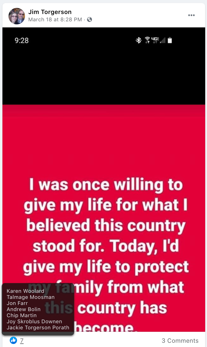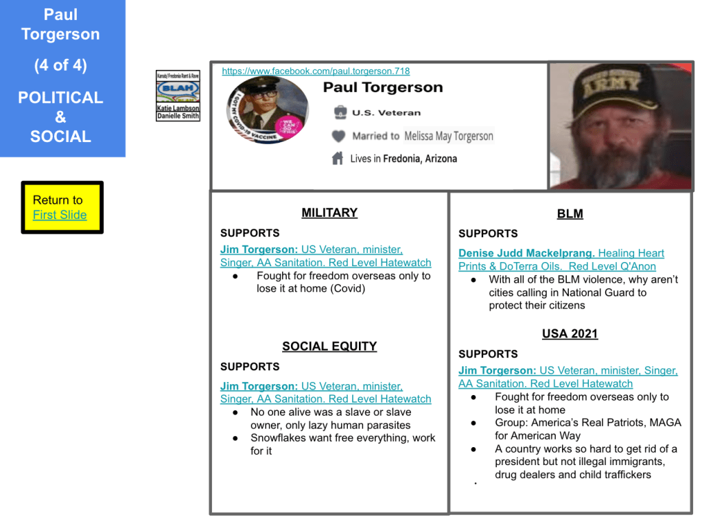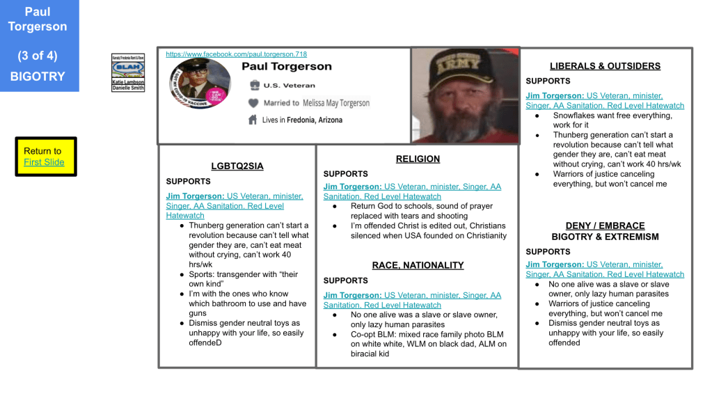 Jim uses his personal FB account to spread extremist rhetoric, and rarely local FB groups. The majority of his FB groups/pages are related to end of times, LGBTQ, Black Lives Matter, cancel culture, anti-liberal and religious. Torgerson’s rhetoric includes false narratives nationally (immigration, racial justice, Capitol Insurrection, election security, social equity) conspiracy theories (freedom, democrats, mail in voting, current “border” crisis, DHS bulletin since Capitol Insurrection, religious), bigotry (democrats, migrants, Black Lives Matter, LGBTQ), and communism. He posts that he would die to protect his family FROM what the USA has become after posting four months prior that he would serve again. If you know Jim, please intervene or reach out to community groups. Resources for intervention Hatewatch. New & Improved
