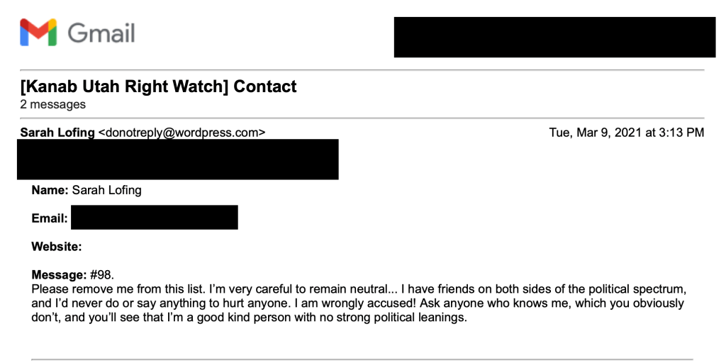 March 9, 2021 Sarah emailed with a request to be removed from Hatewatch. Sarah was offered removal after April 30, 2021 if she ceased engagement in bigotry and/or extremism. See resources for Reforming Extremists on Hatewatch.