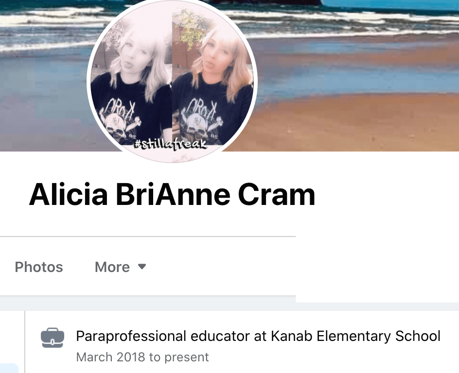 Alicia Cram posts that she works as a paraprofessional educator at Kanab Elementary School (KES) and owns a photography business. She supports local hate group Kanab Patriots ( see Kane County Commissioner Calls Kanab Patriots a Hate Group, But They Are Not the Fringe and “Kanab Patriots” Recruits and Radicalizes Facebook Extremists) and she & family have shown support for Kanab at DC Capitol Riot.