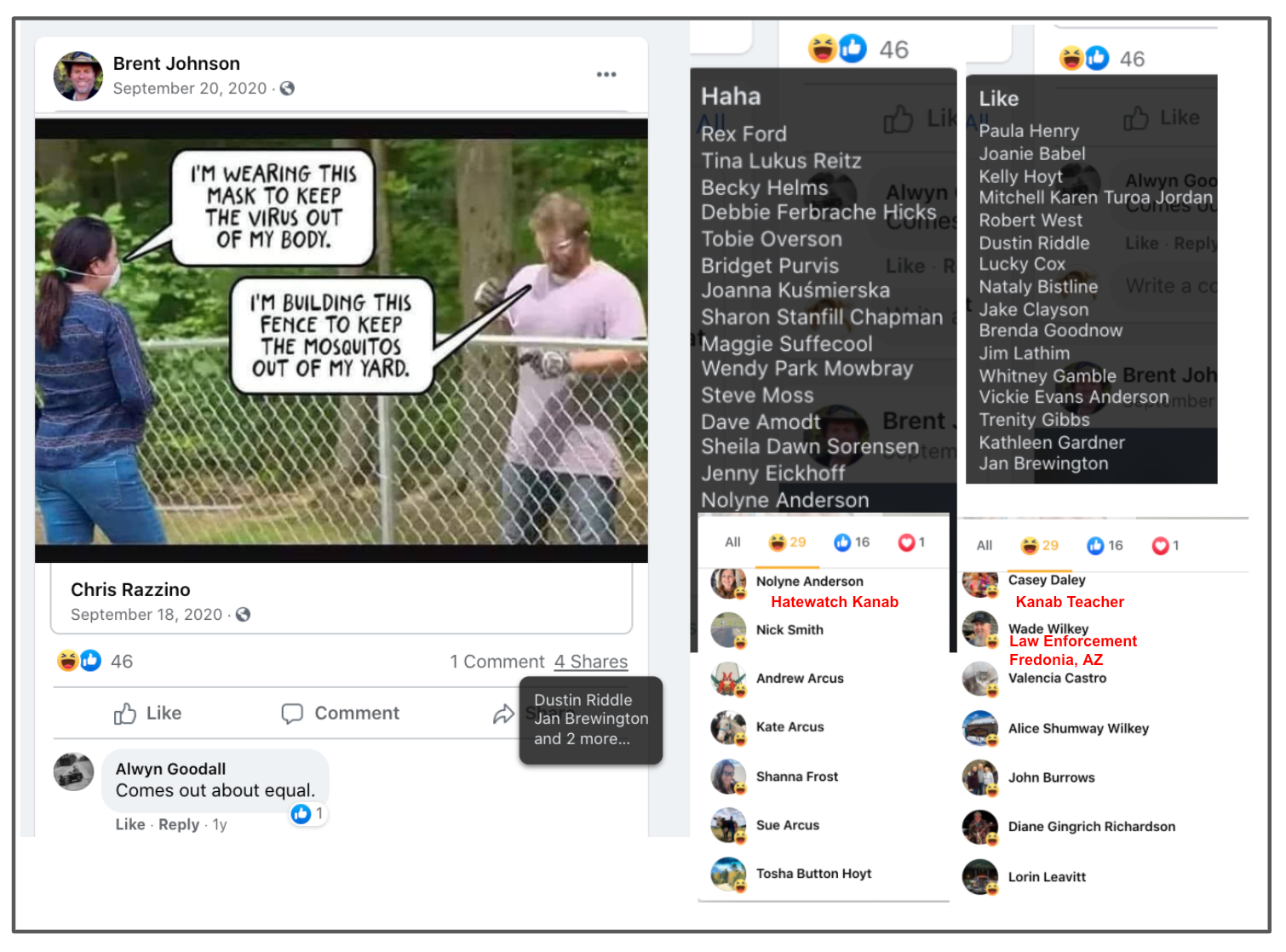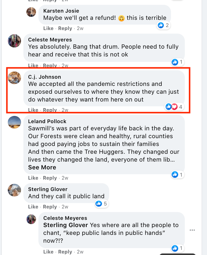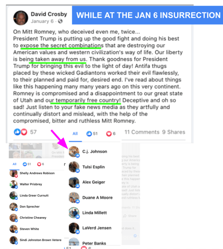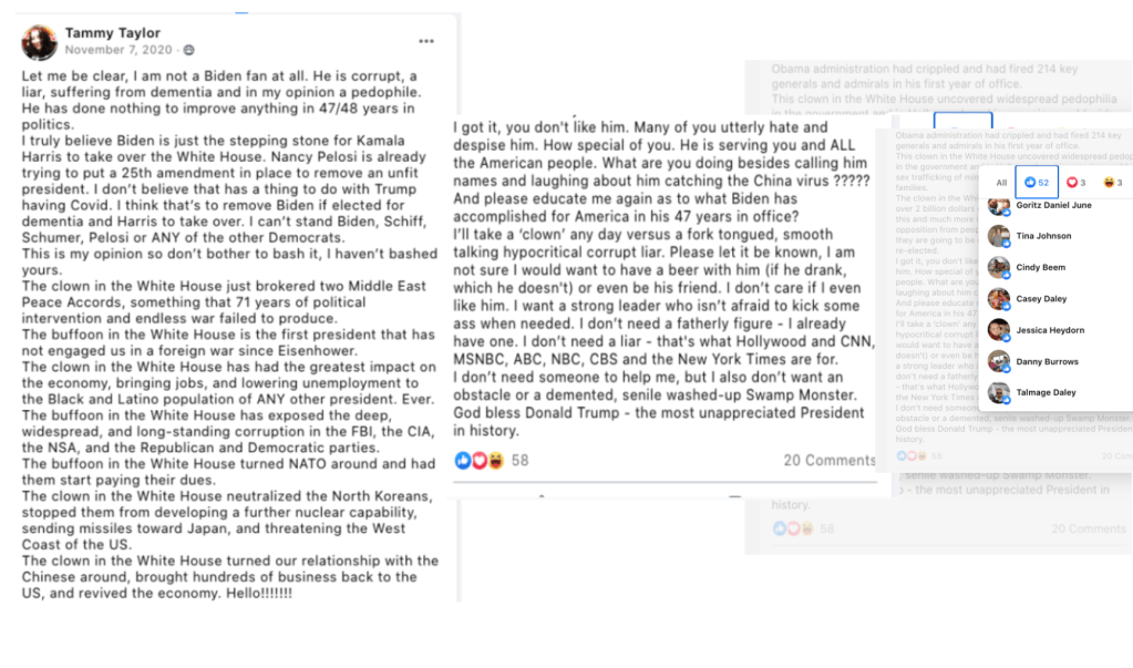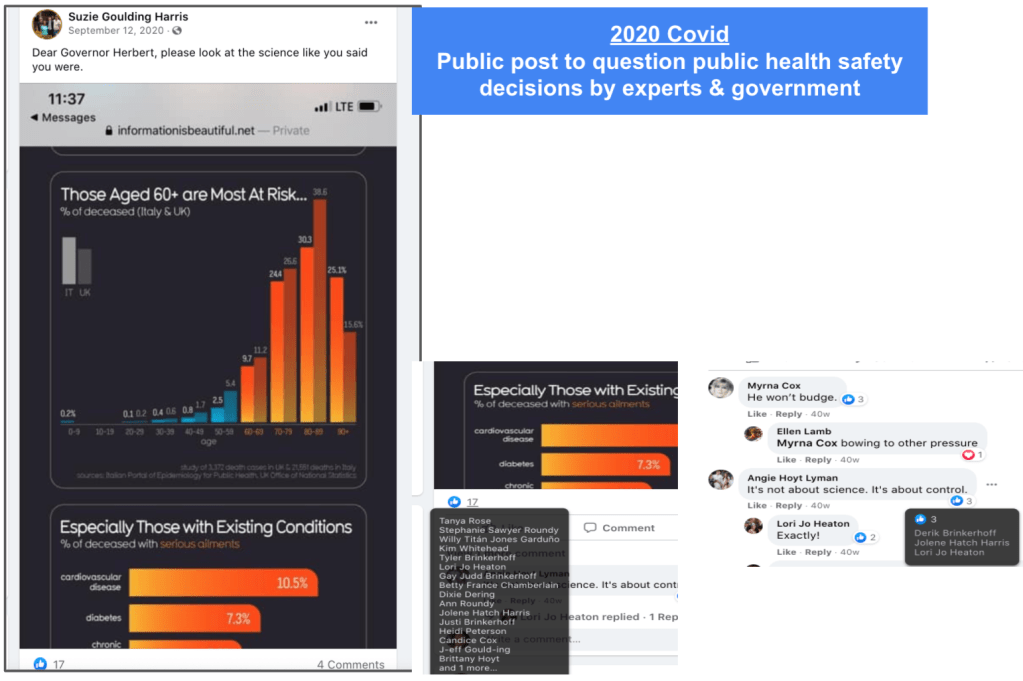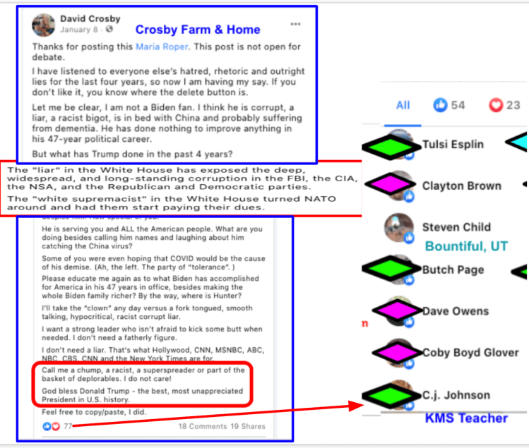 Alicia’s extremism includes: promoting false narratives, outright lies, support of Stop-the-Steal, minimizing Capitol Insurrection. Alicia has supported FB page “Kanab Patriots” Recruits and Radicalizes Facebook Extremists and their activities including their harassment of residents & businesses supporting Black Lives Matter & characterization of liberals as sick people. Alicia used local FB group Kanab/Fredonia Rant & Rave as a platform for hate to sabotage social justice & police reform efforts and to defend confrontational activity of counter protesters, including Steve Corson who was a Kanab “Patriots” at the Capitol Insurrection and Local Law Enforcement Praise.