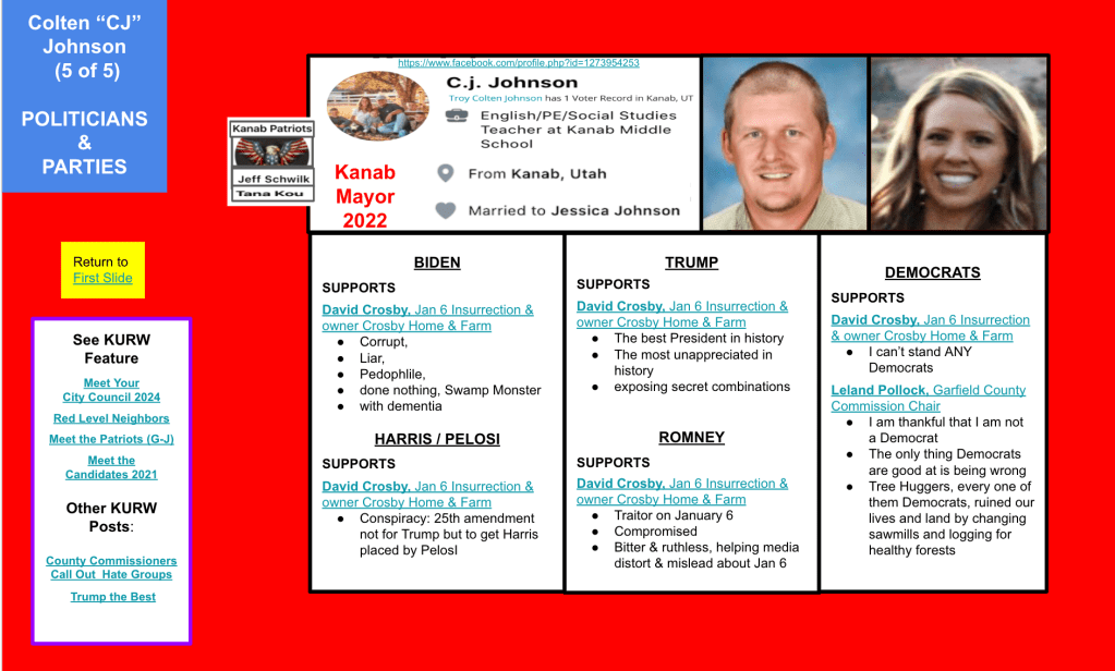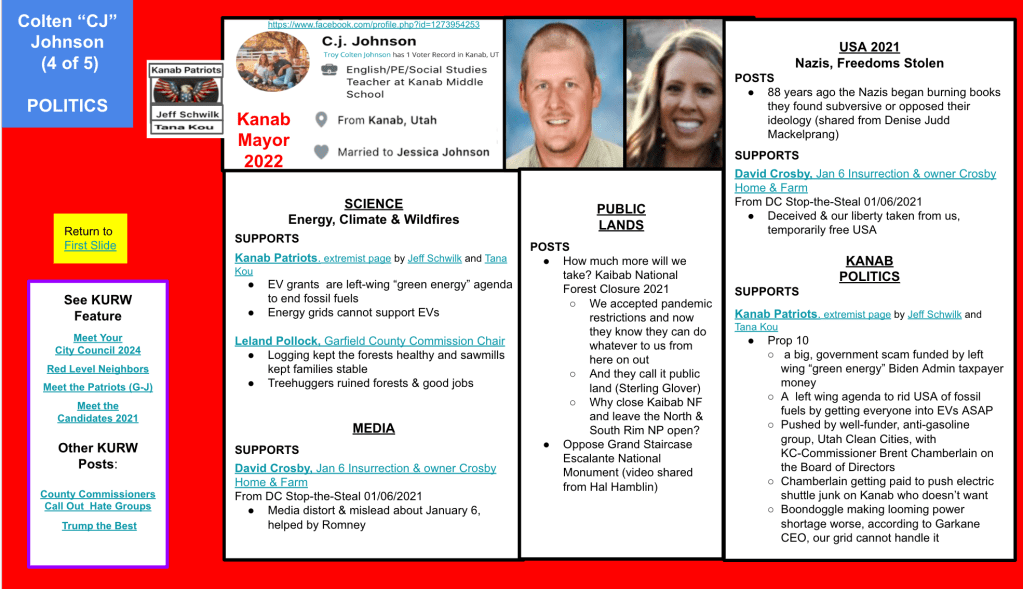 Colten became Mayor of Kanab City in 2022. He is designated a Red Level Neighbor for the content of his posts, his influence potential and his association with Kanab Patriots. That content is categorized in the screenshots of the Google Slides below