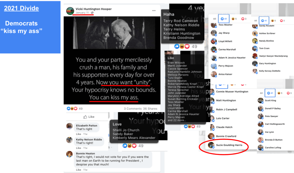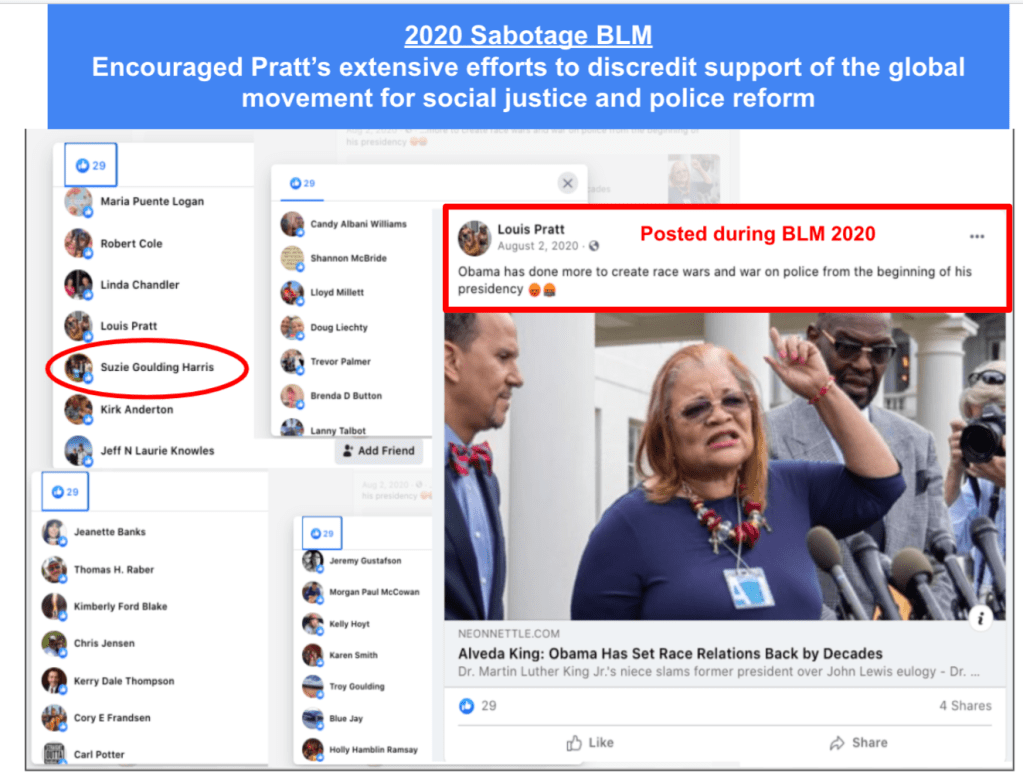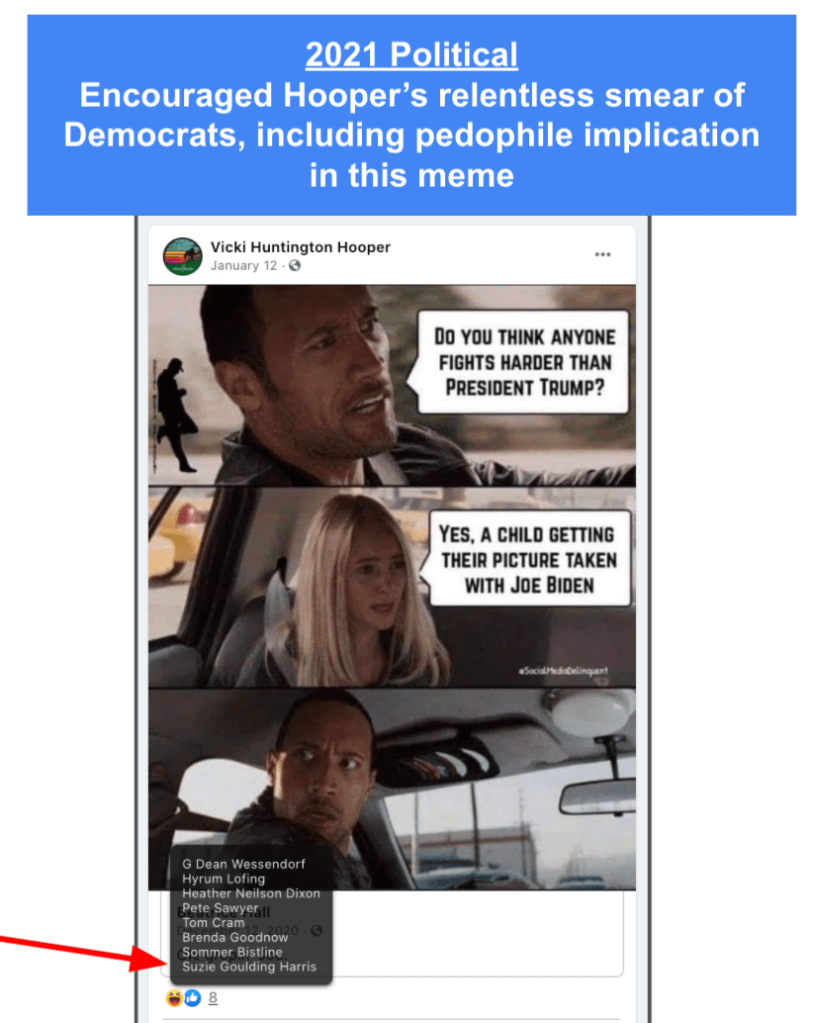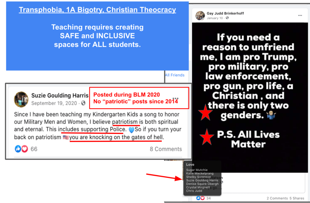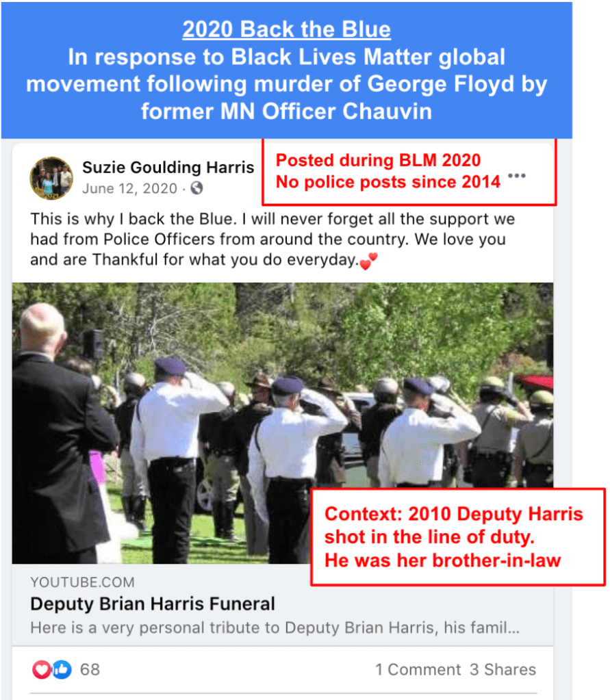 Harris posts publicly hard-line eternal religious philosophy and other bigotry. She supports posts by some Red Level Hatewatch Neighbors (Hooper, Pratt & Brinkerhoff). Harris had no public posts of Patriotism (military, veterans, law enforcement) since 2014 until the global movement for Black Lives Matter following the murder of George Floyd by convicted former MN officer Chauvin. (Context: Suzie’s brother-in-law was killed in the line of duty in 2010)