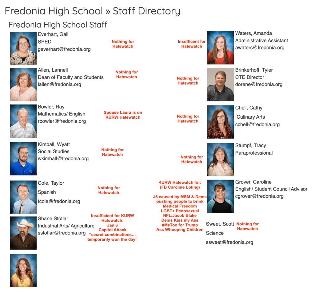 The 2022 Fredonia-Mocassin School District Staff is pictured below with red font indicating evidence of extremism or bigotry exposed. Their evidence is summarized in a bullet-point list below the photo.