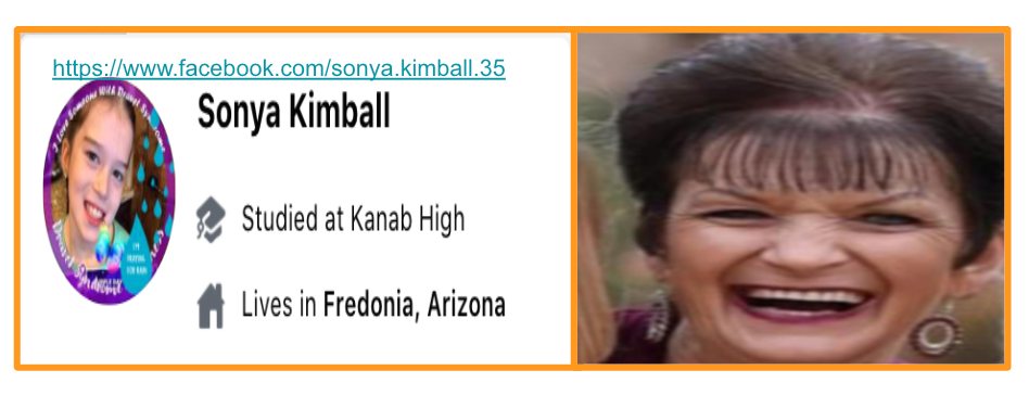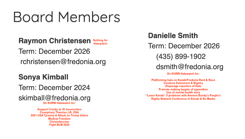 | Sonya Kimball: Support J6er David Crosby at the attack of the US Capitol, Conspiracy theories (J6 False flag Antifa, 25th Amendment for Harris to replace Biden not for Trump), Calls to Fight (Medical Freedom, BLM 2020, Don’t Tread on Me), USA 2021 Tyranny (loss of freedom and attack on Trump voters), Christofascism | Danielle Smith: See feature post for Smith at KURW Understanding Social Media in Kanab: Groups, Pages & Individuals. Smith provides a platform of hate with Kanab/Fredonia Rant & Rave, encourages those on Hatewatch to post away, uses mental health slurs, disparages those who report extremism/bigotry, promotes making targets of opposition and responds “MOVE” to voiced concern about Ammon Bundy’s People’s Rights Network Conference in Kanab & their public health defiance. |