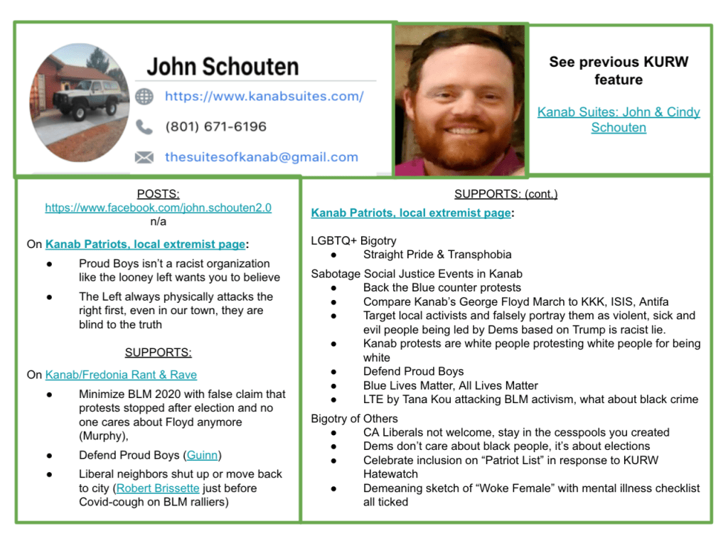 I resided in the Kanab, Utah area from 2009 throughout 2020. I created KURW following the January 6, 2021 attempt by domestic extremists to stop the certification of the election which nearly a dozen Kanab area residents participated and were encouraged by the Kanab City Police Chief & fellow law enforcement. I resided most of my life in rural America and was raised in a large, far-right family.