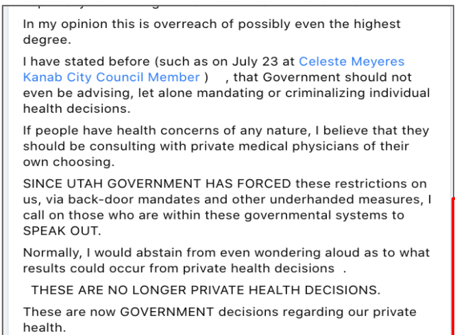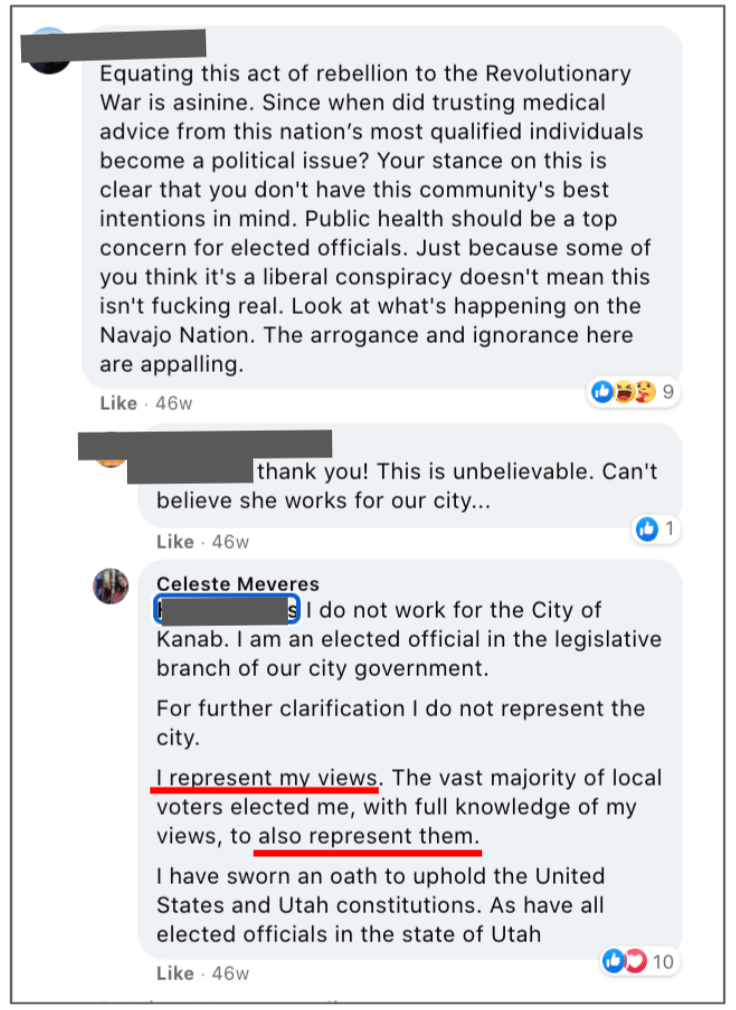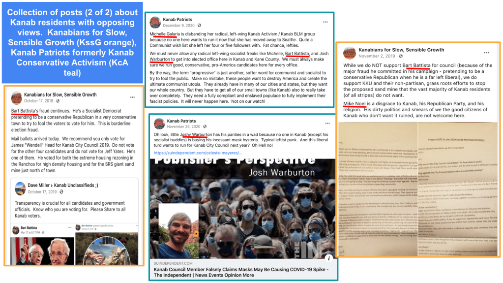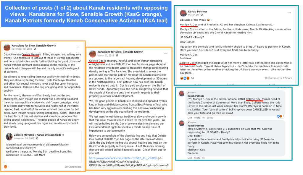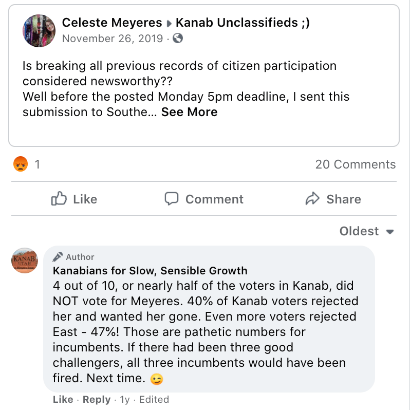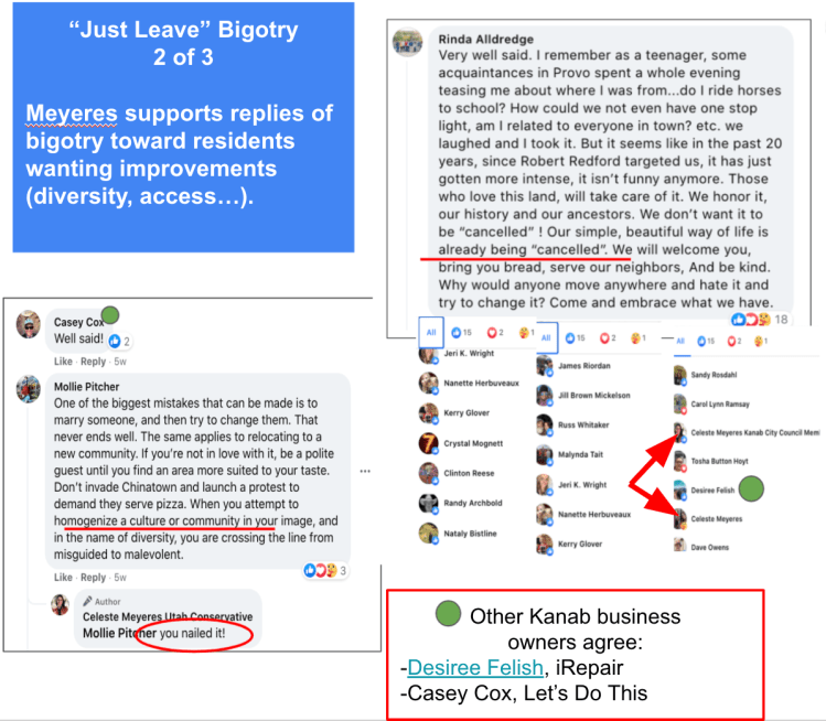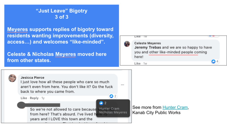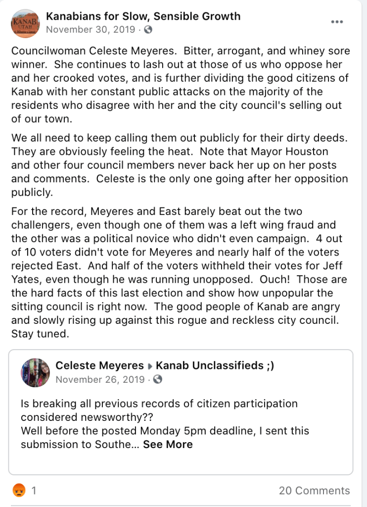 - advised Kanab voters to vote against Celeste for re-election (Oct 17, 2019 post)