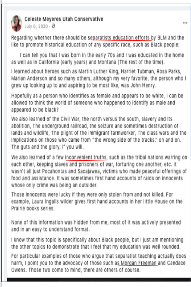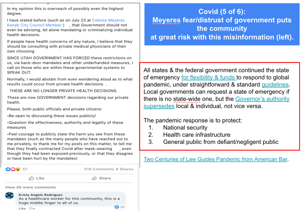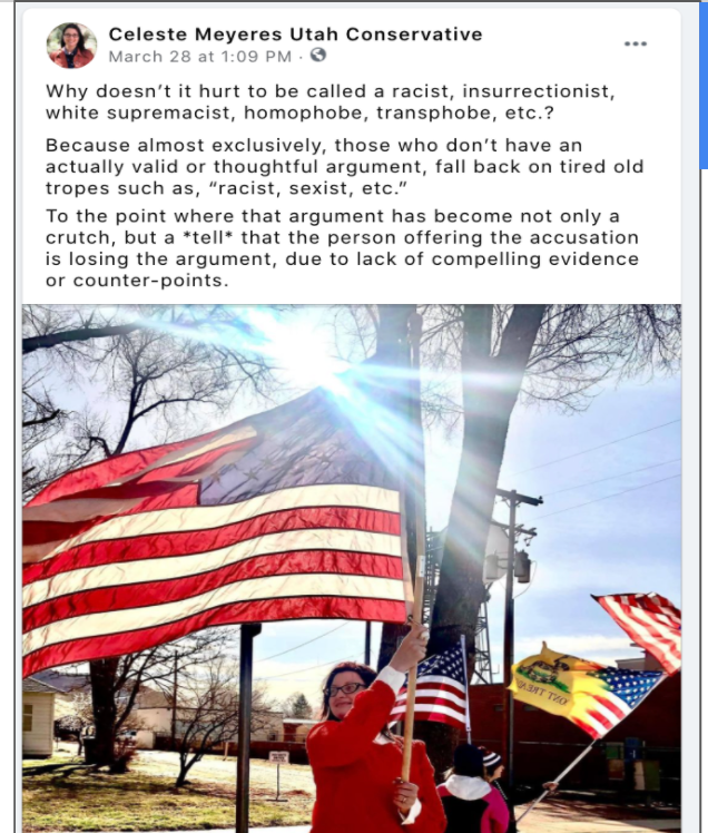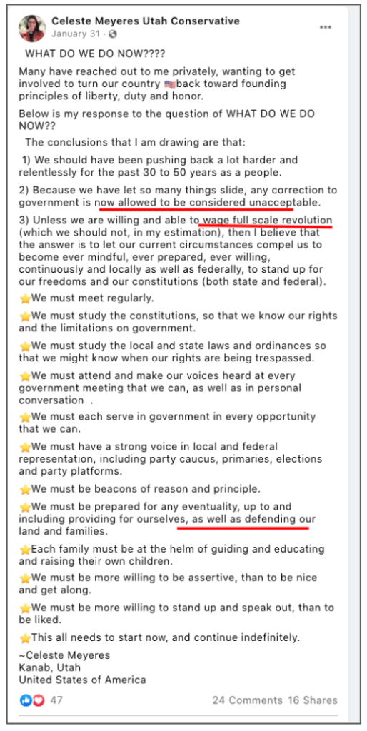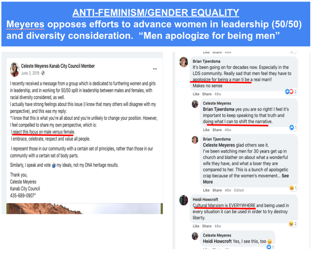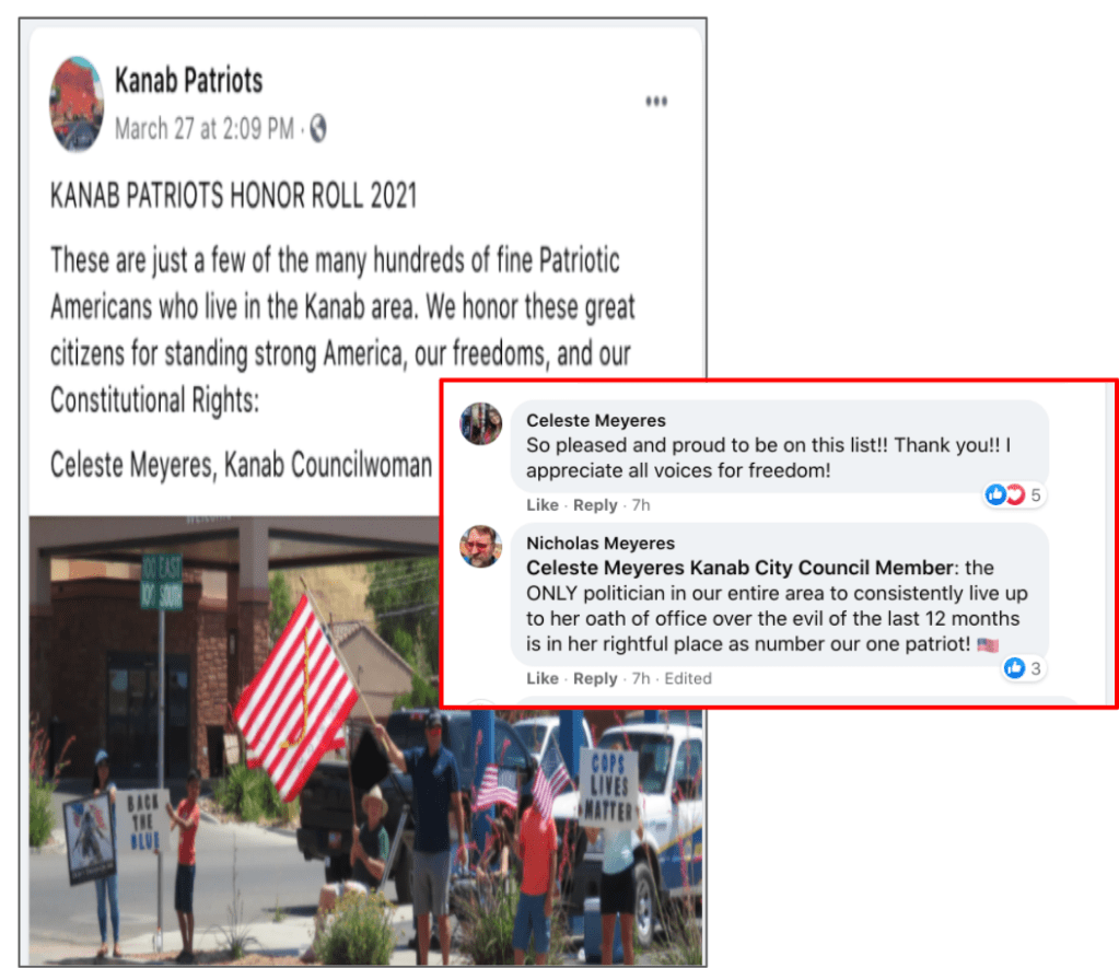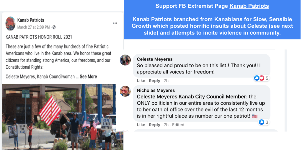 Celeste uses FB pages Celeste Meyeres Utah Conservative and Celeste Meyeres Kanab City Council Member to post extremist rhetoric. They both support local FB extremist page “Kanab Patriots” Recruits and Radicalizes Facebook Extremists and Ammon Bundy’s People’s Rights Network. The posts use fear, misinformation, false narratives and conspiracy theories.