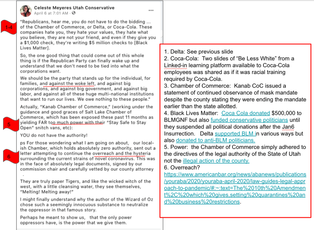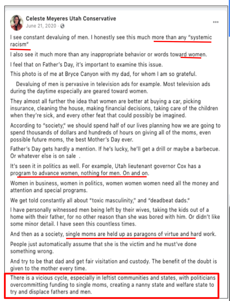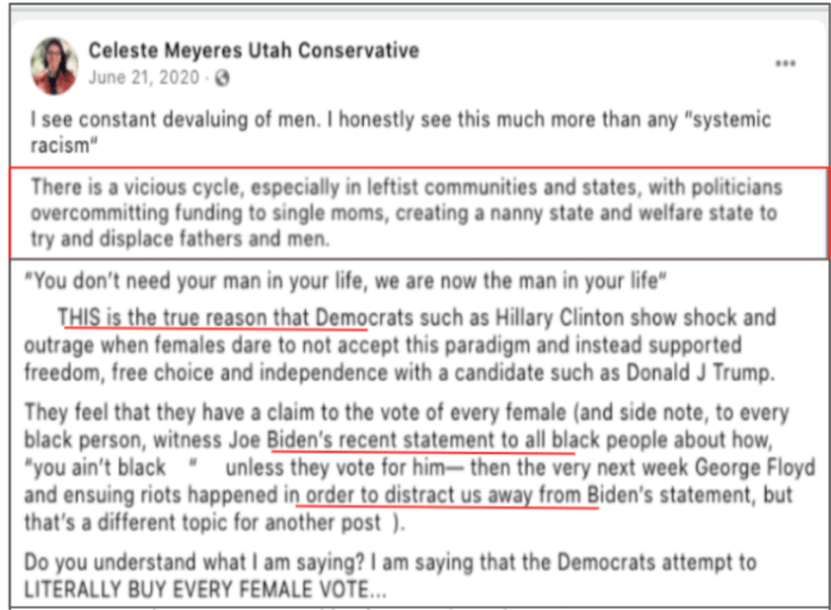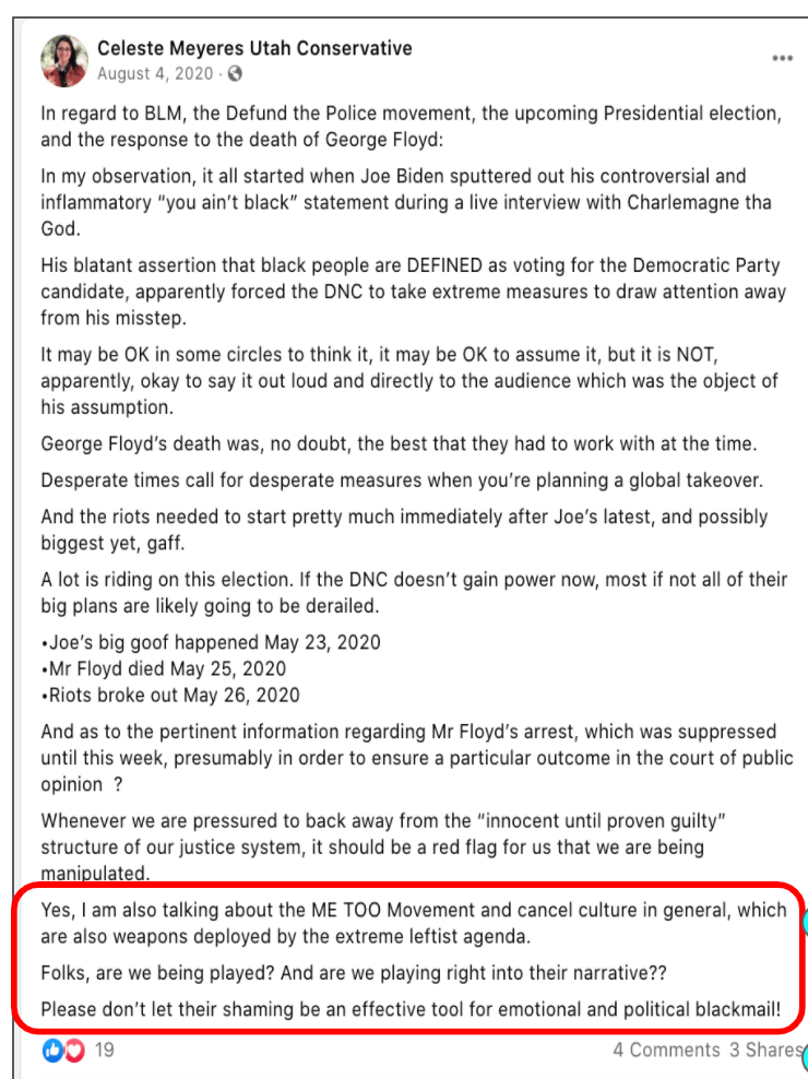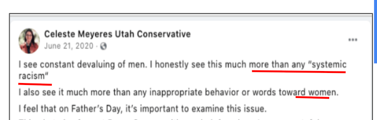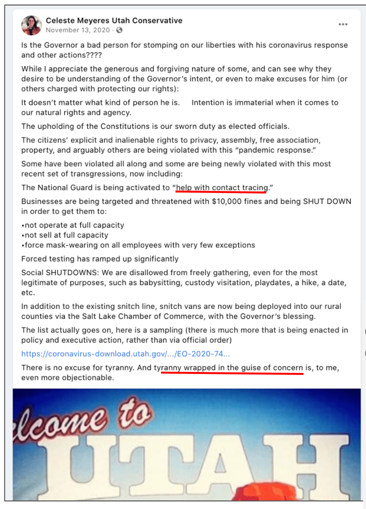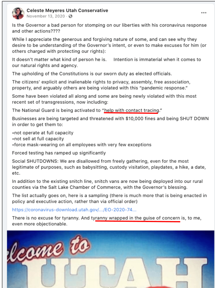 Celeste uses FB pages Celeste Meyeres Utah Conservative and Celeste Meyeres Kanab City Council Member to post extremist rhetoric. They both support local FB extremist page “Kanab Patriots” Recruits and Radicalizes Facebook Extremists and Ammon Bundy’s People’s Rights Network. The posts use fear, misinformation, false narratives and conspiracy theories.
