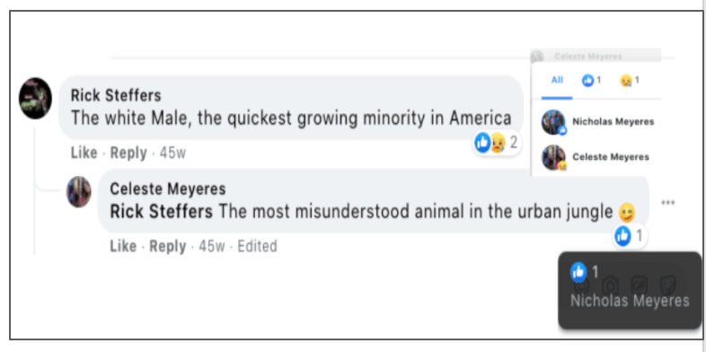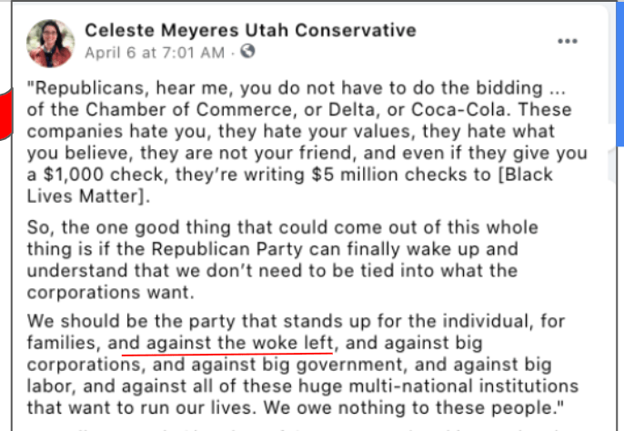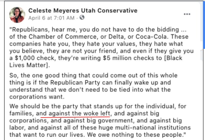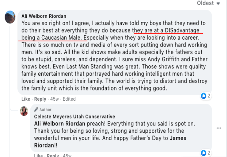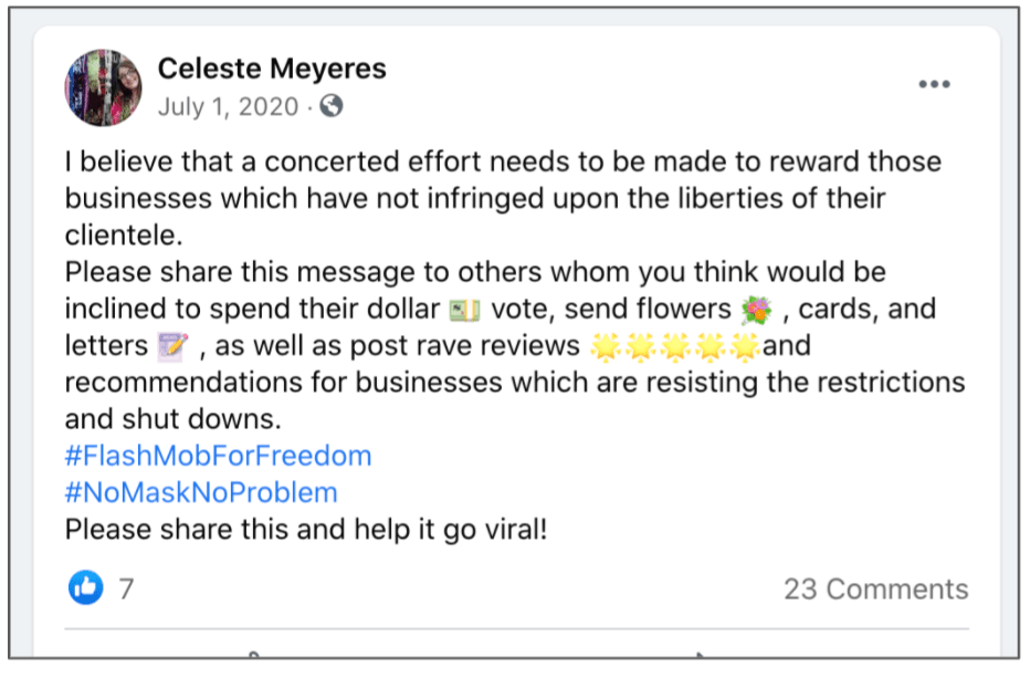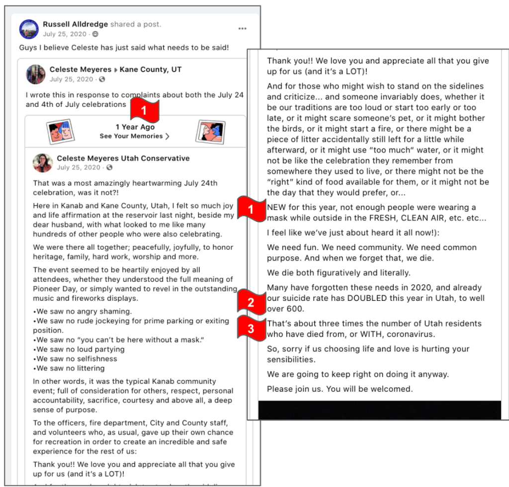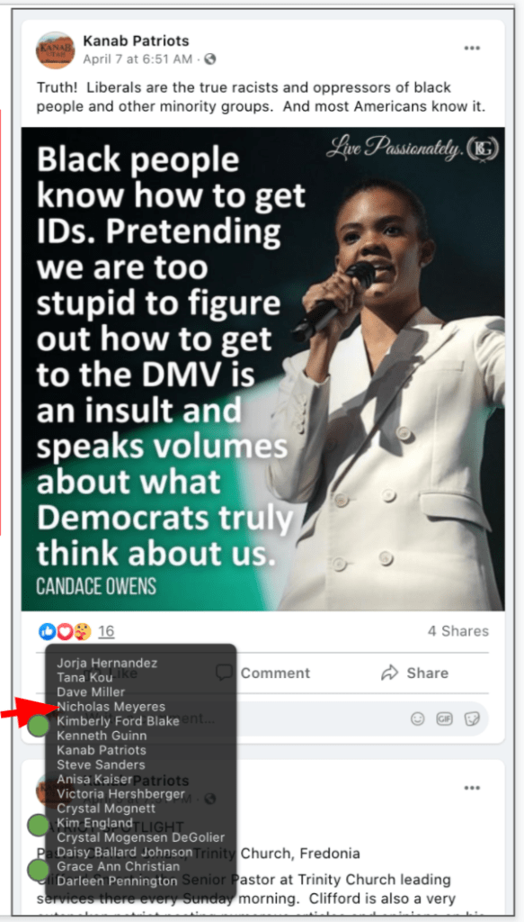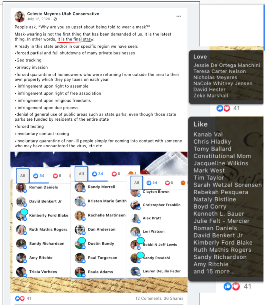 Celeste uses FB pages Celeste Meyeres Utah Conservative and Celeste Meyeres Kanab City Council Member to post extremist rhetoric. They both support local FB extremist page “Kanab Patriots” Recruits and Radicalizes Facebook Extremists and Ammon Bundy’s People’s Rights Network. The posts use fear, misinformation, false narratives and conspiracy theories.