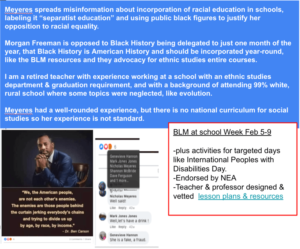 - opposes racial justice/equality teaching, focusing on one group