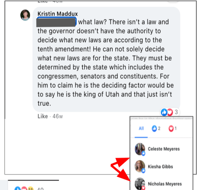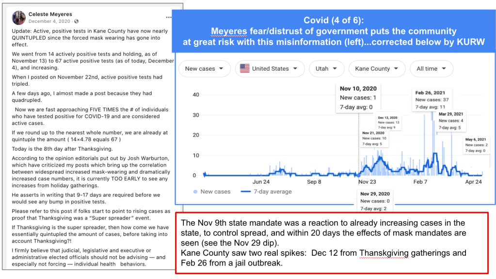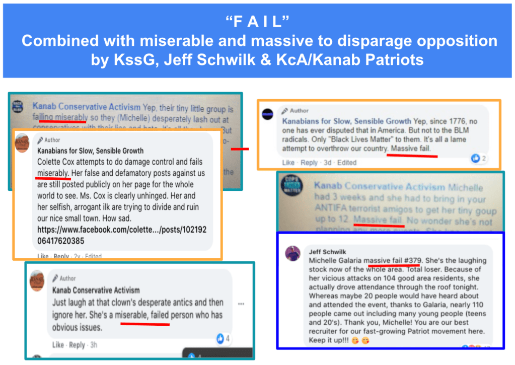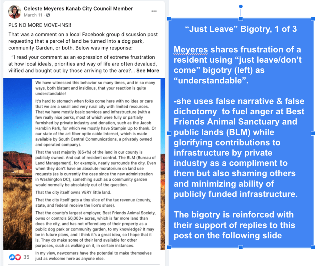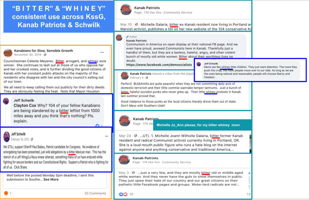 Just like David Crosby, I had no idea of their extremist views & actions, inappropriate work behavior, or personal violent behavior before collecting information for KURW because they are all so friendly. It is painful to see how they really feel and learn of things they have done. I had hoped that any individual seeing the harm done by the FB page Kanab Patriots would have stopped engagement with that page. Maybe, when it was “others” in the community being harassed, it wasn’t enough given Celeste’s stated “individual over community” mantra. Now that the individual aspect applies will she stop encouraging such hate?