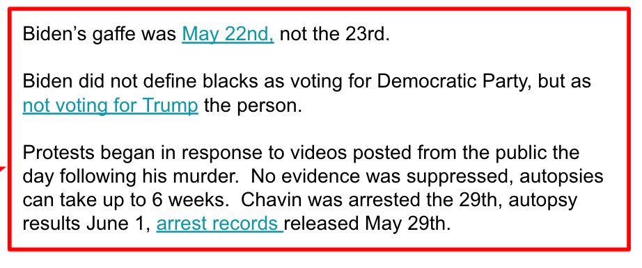 - Police brutality riots were Democratic agenda to deflect from a Biden gaffe (followed by corrections in red box)