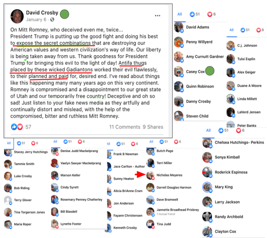 - LDS Secret combinations & placed Antifa thugs work to destroy USA and take freedoms with help of media & Romney (Crosby posted that from his attendance at the Capitol Insurrection)