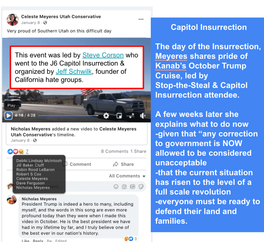 - Capitol Insurrection: the day of, Celeste shared pride of Kanab’s Trump Cruise in October which was led by Steve Corson (who went to the J6 Capitol Insurrection) and Jeff Schwilk (founder of hate groups in California)