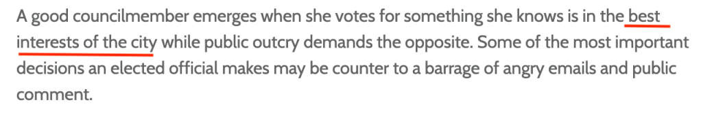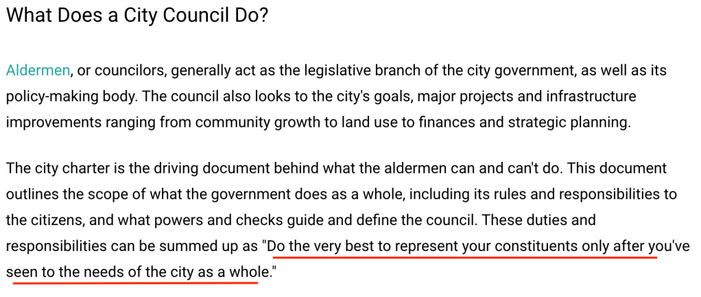 - represent constituents only AFTER you’ve seen to the needs of the city as a whole