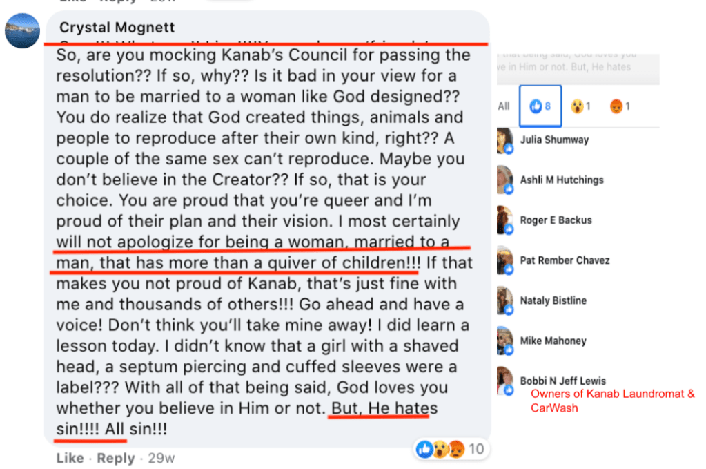 “Kanab envisions a local culture that upholds the marriage of a woman to a man and a man to a woman as ordained by god”