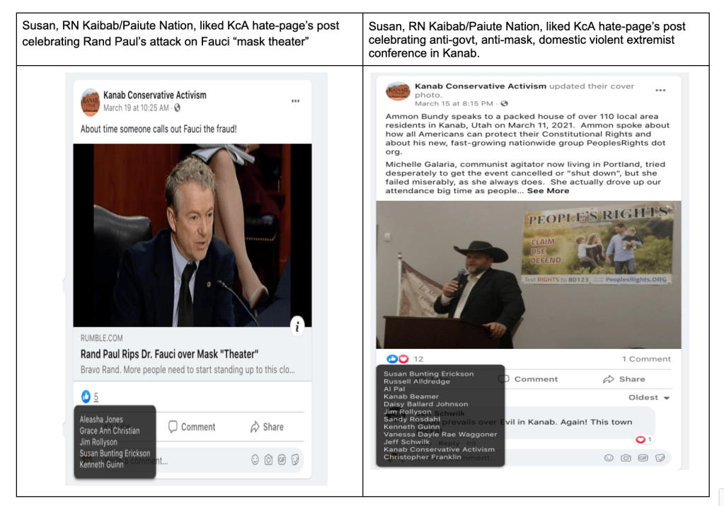 Update 09/06/2021. Susan posts her employment as RN at the Kaibab Band of Paiute Indians. This is concerning given her support of anti-mask rhetoric, Bundy’s People’s Rights Movement, and racism. Susan encourages extremism & bigotry on local FB pages/groups9