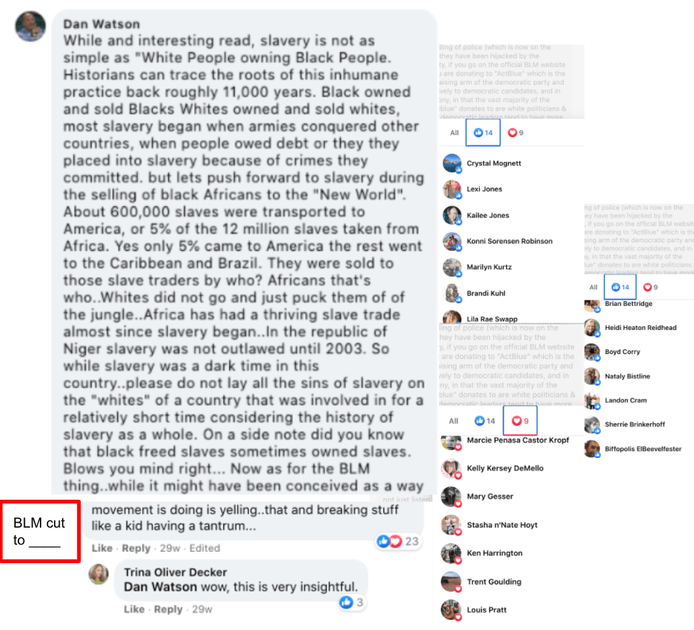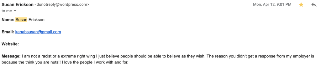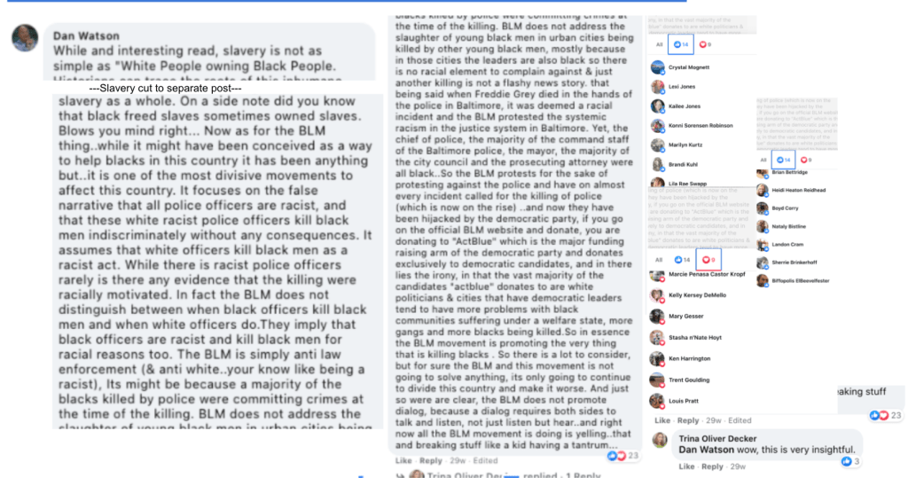 Susan supported effort to sabotage the 2020 Social Justice & Police Reform Movement. She encouraged Kym Cloughesy’s mischaracterization of BLM as a terrorist organization, Kane County Jail Commander Dan Watson‘s extensive misinformation about funding, denial of police brutality and mischaracterization as “anti-white, racists”, and Trent Goulding’s denial of systemic racism.