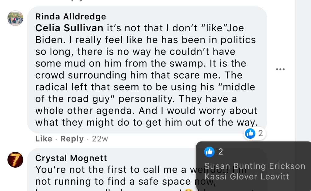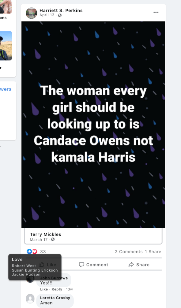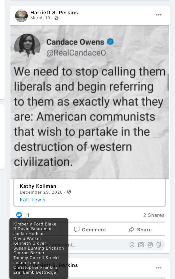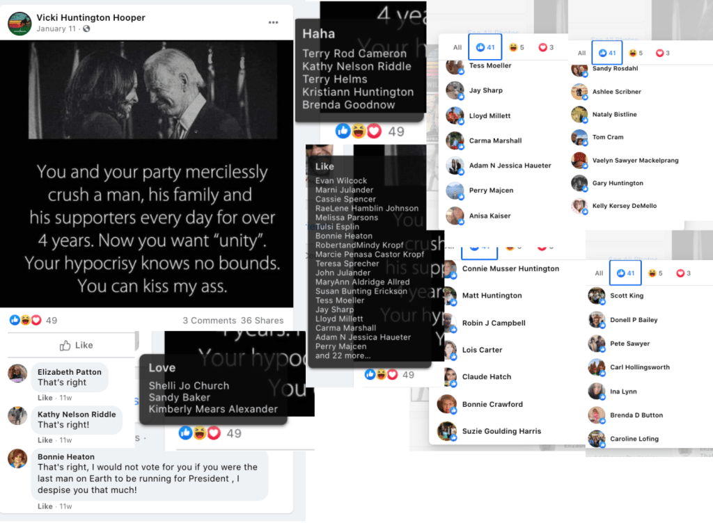 Susan supports Vicki Huntington’s Hooper’s continued Trumpism and anti-democrat divisiveness including: “kiss my ass Democrats” after J6 Insurrection call for unity, “It’s all downhill from here, we’ve lost the best President we’ve ever seen”, and portraying Biden as destroying the country and Democrats the criminals. Susan liked Rinda Alldredge’s conspiracy theory that the leftist’s agenda is to remove Biden to make way for Harris.