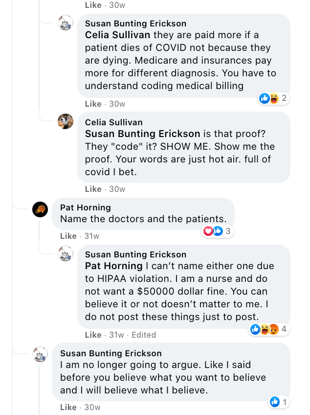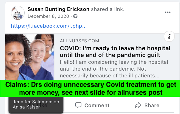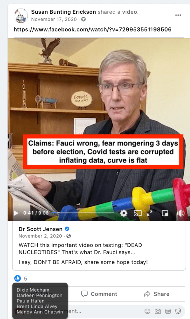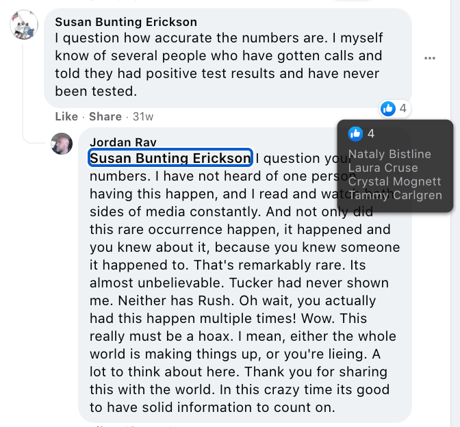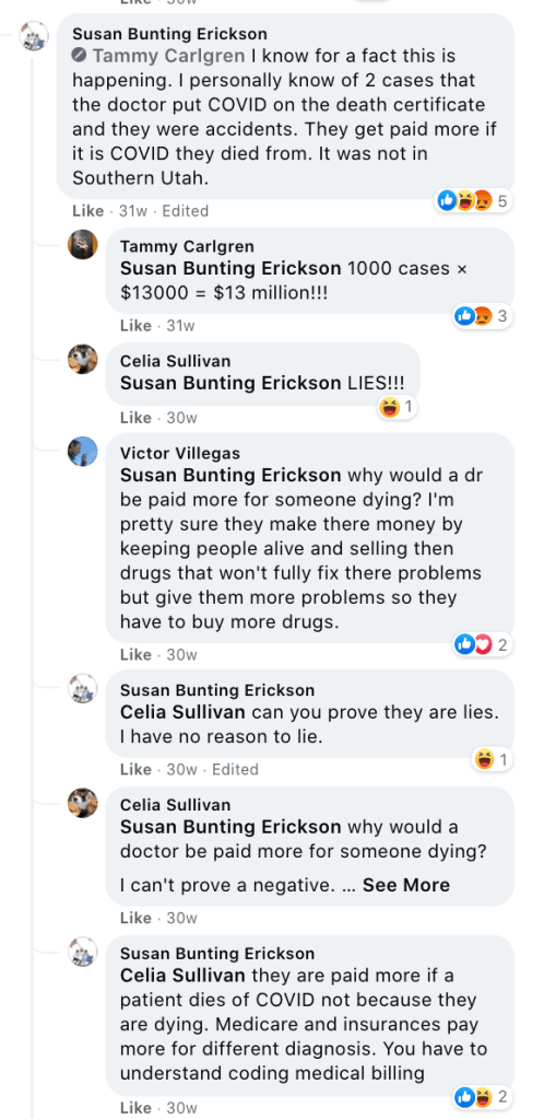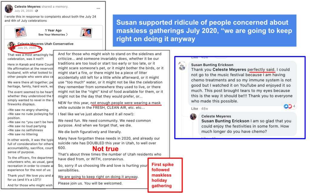 Susan spread Covid misinformation via Celeste Meyeres Page (City Council: Celeste Meyeres) and local group Kanab/Fredonia Rant & Rave. This includes a video discrediting Fauci implying election conspiracy, a post from a nurses group about doctors doing unnecessary Covid treatments to get money, Susan’s own testimony that doctors record false Covid death to get money and people get calls of positive test results who were never tested. Susan also supported Council Meyeres’s ridicule of concern over maskless 4th of July with false suicide stats and “we are going to keep right on doing it anyway”