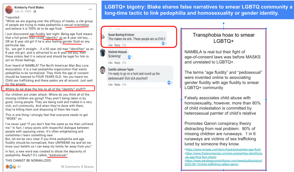 Susan encouraged Kimberly Ford’s Blake smear tactic, falsely linking pedophilia with LGBTQ+ community with a bonus mask jab.