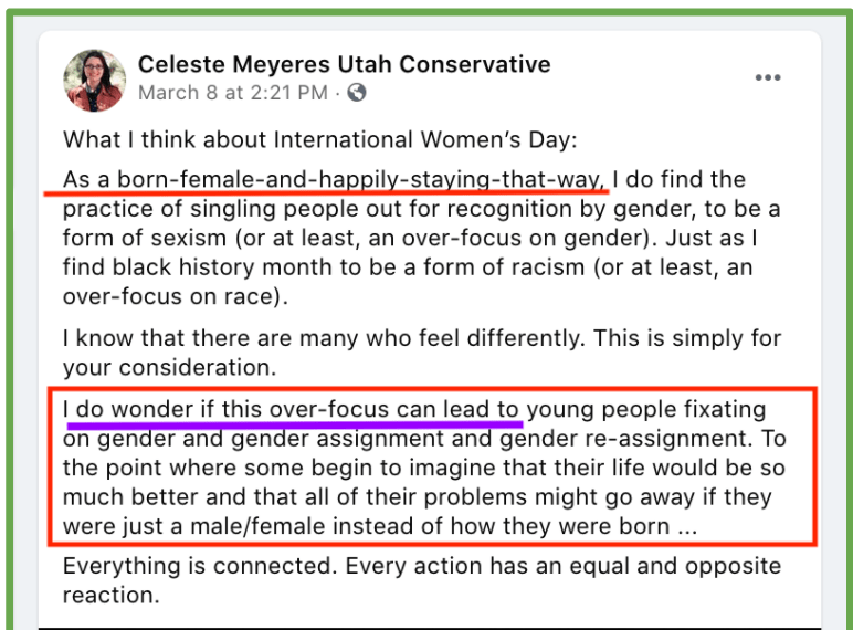 Kanab City Council members Celeste Meyeres & Byard Kershaw. Valley Elementary Teacher Suzie Harris and Kanab Middle School Staff Terry Blake. Retired law enforcement Marson Keller. They all ignore the current science regarding gender and push the outdated binary approach to gender. At the minimum this completely voids intersex individuals. The all use or support dehumanizing and inaccurate language & memes. Celeste Meyeres implies indoctrination as a concern despite current research that children form rigid gender identities by 5 or 6 years old which were reinforced and rewarded by societal gender stereotypes and suppress their true gender identity, however, that rigidity becomes more flexible over time (Mayo Clinic).