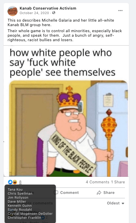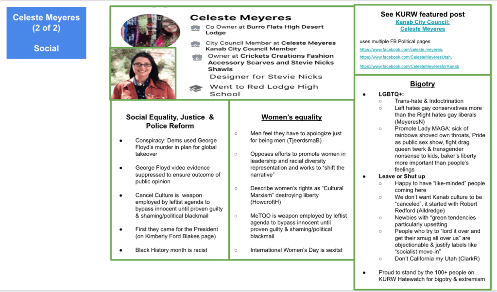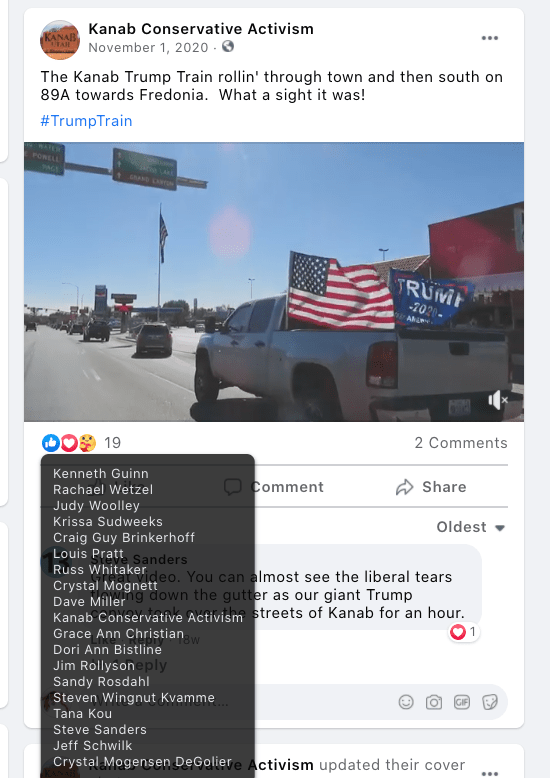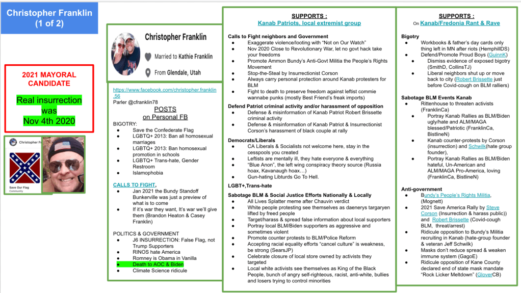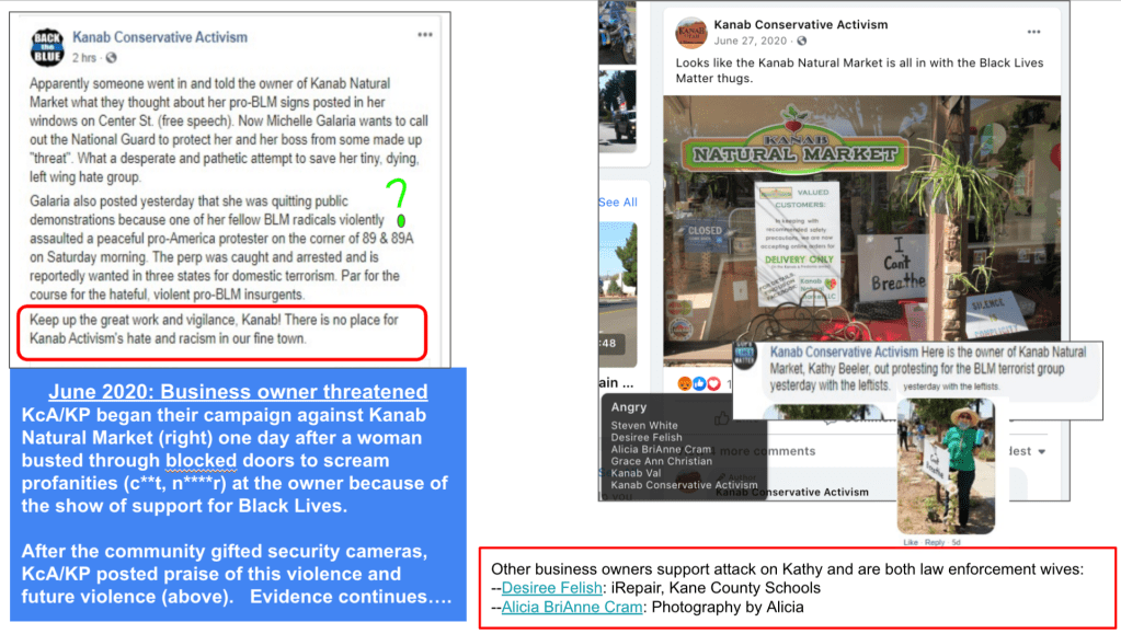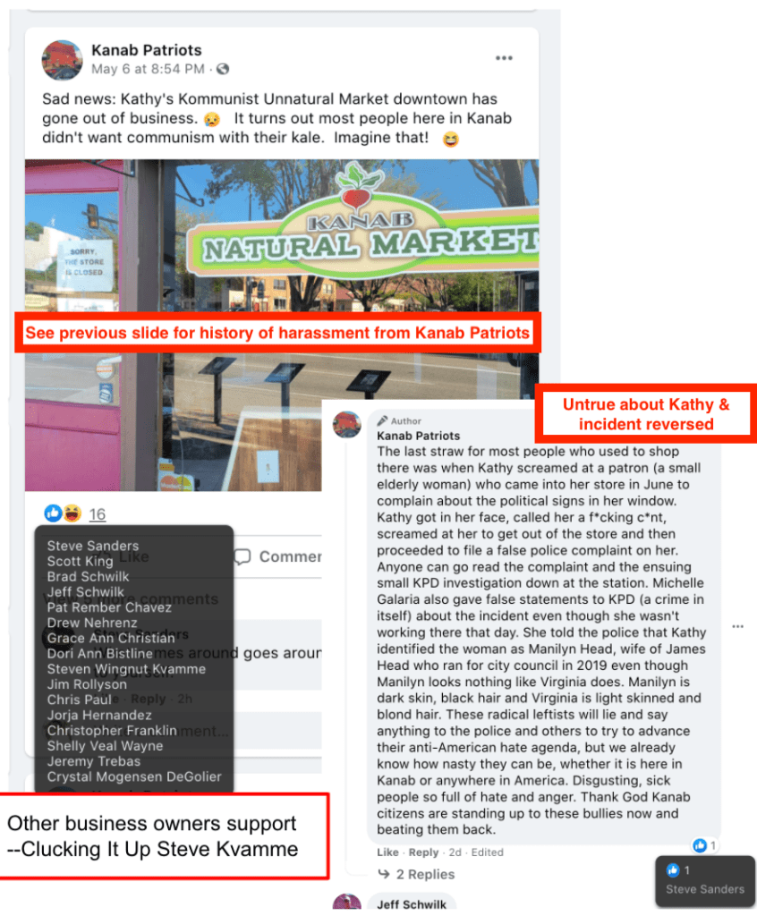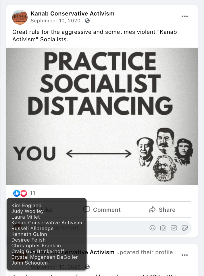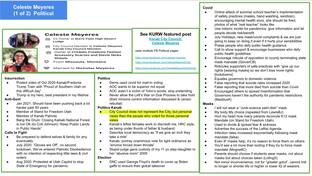 - Kanab Patriots: a FB created to target Black Lives Matter supporters then continued with general far-right rhetoric and targeting liberals.