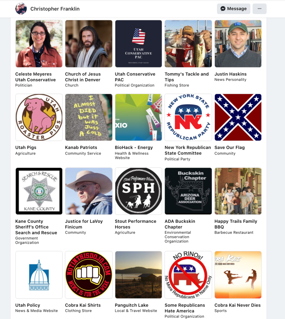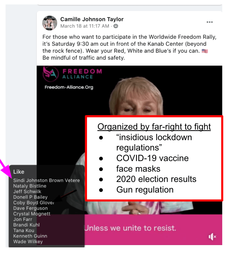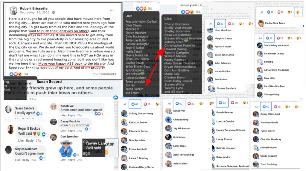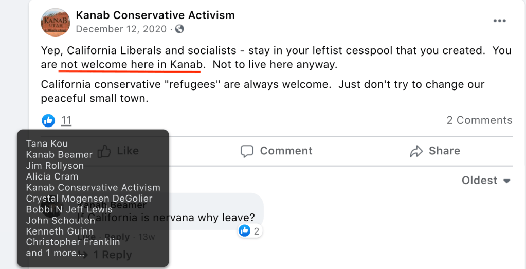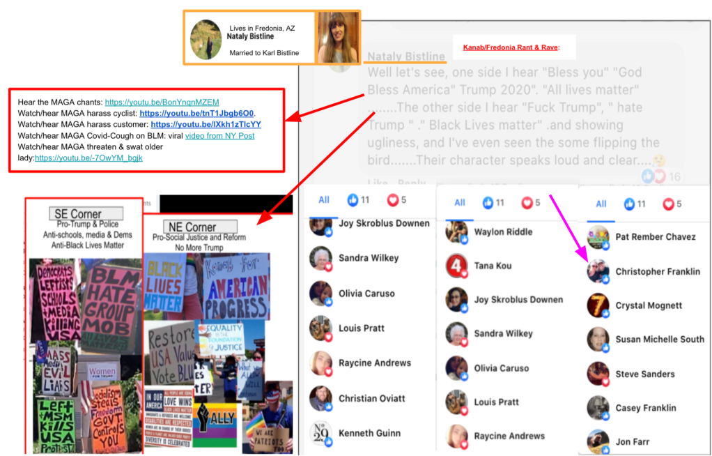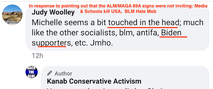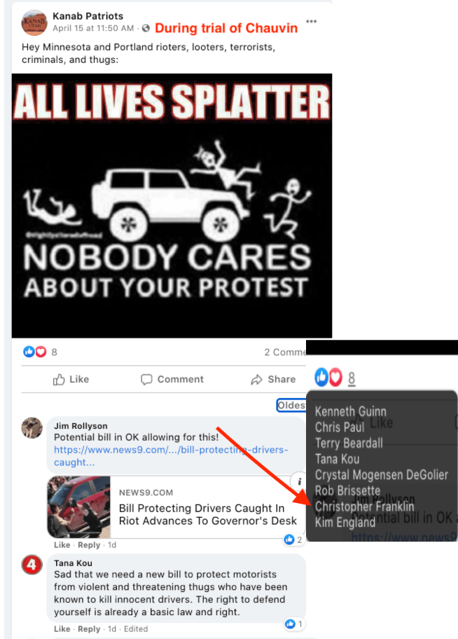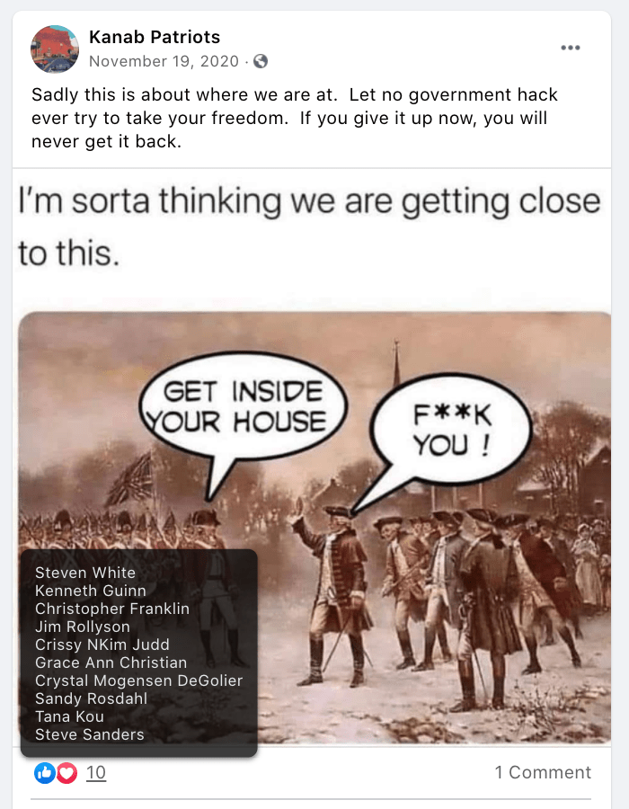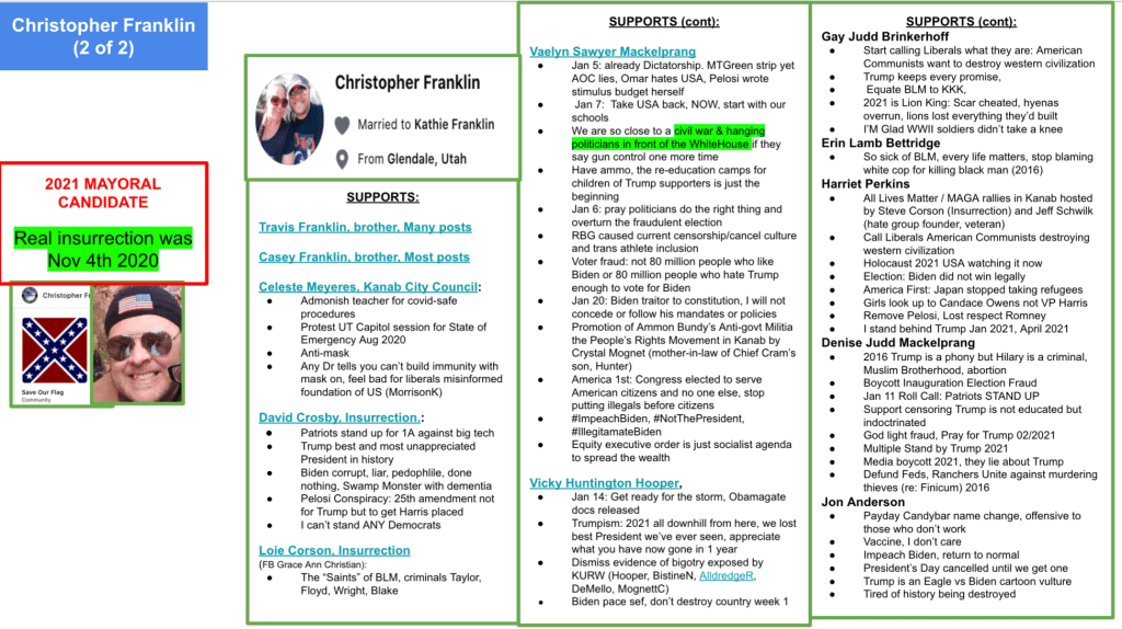 - Kanab Patriots: a FB created to target Black Lives Matter supporters then continued with general far-right rhetoric and targeting liberals.