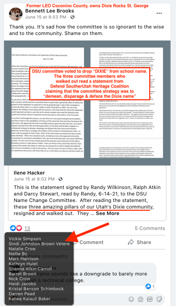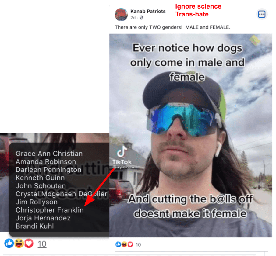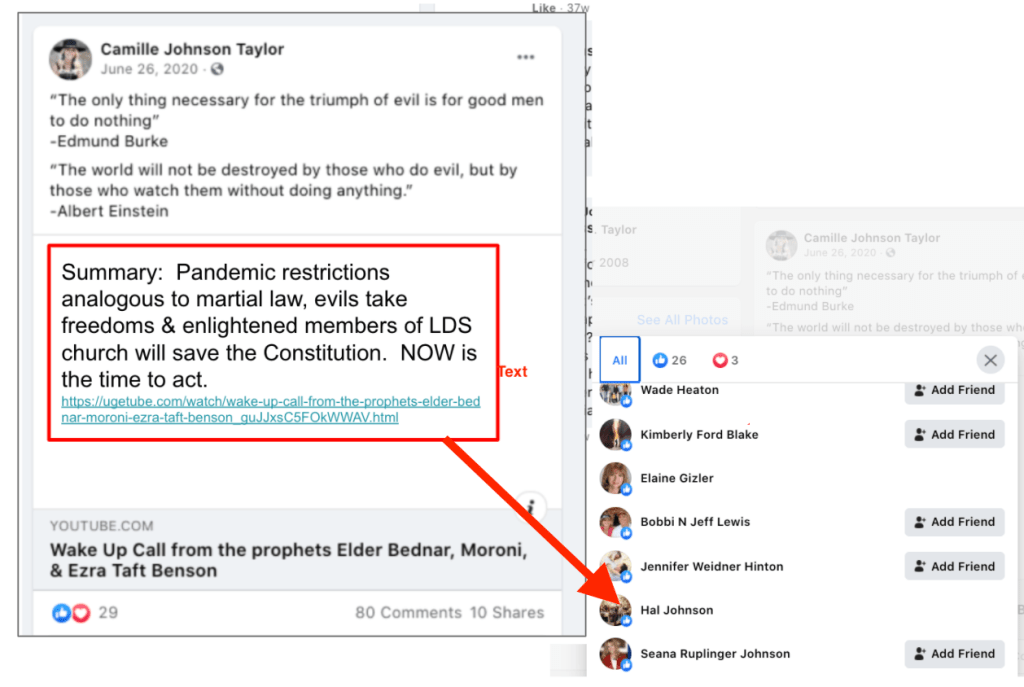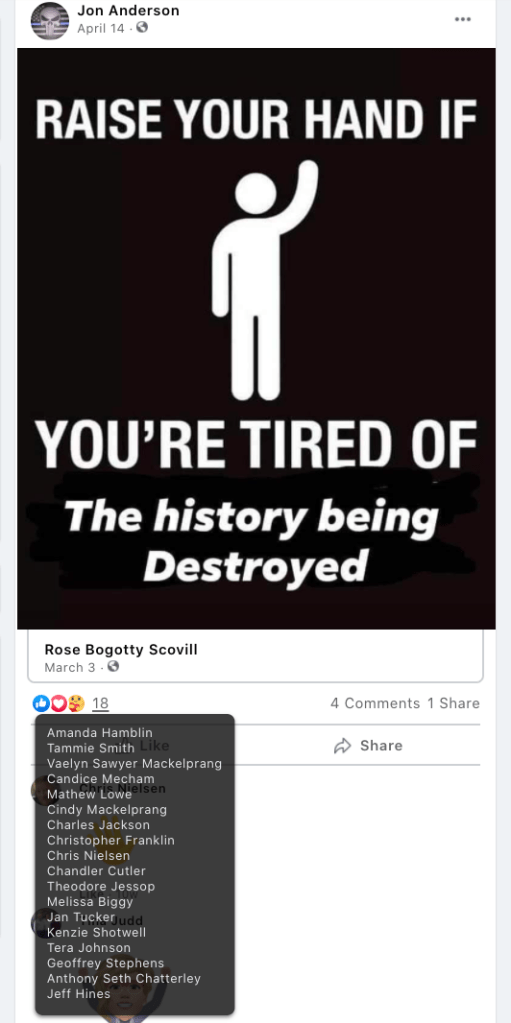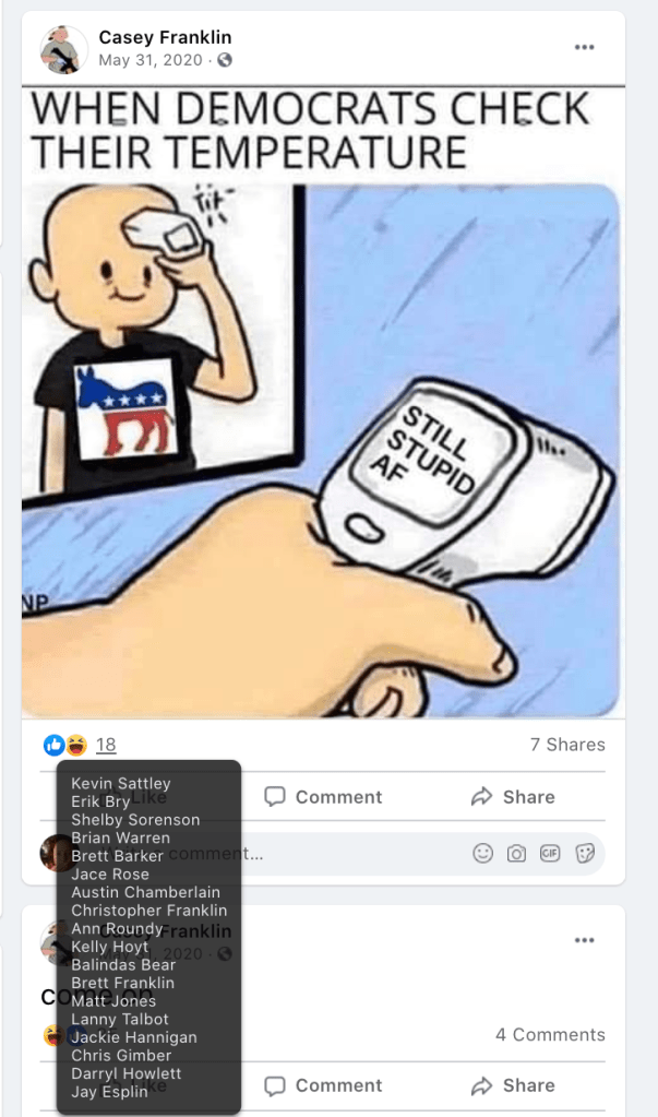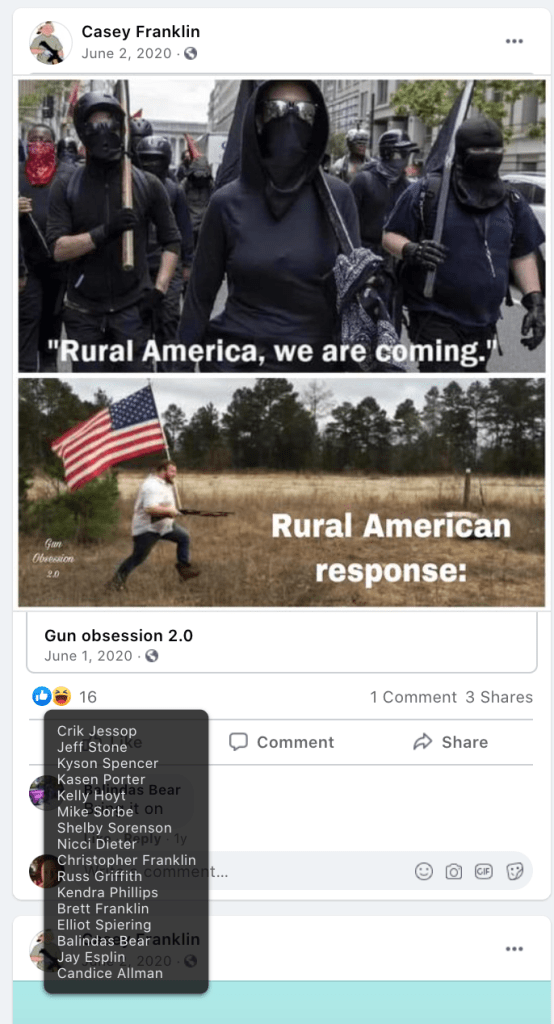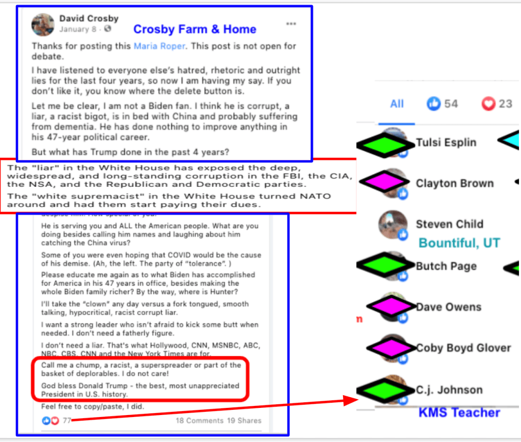 - Kanab Patriots: a FB created to target Black Lives Matter supporters then continued with general far-right rhetoric and targeting liberals.