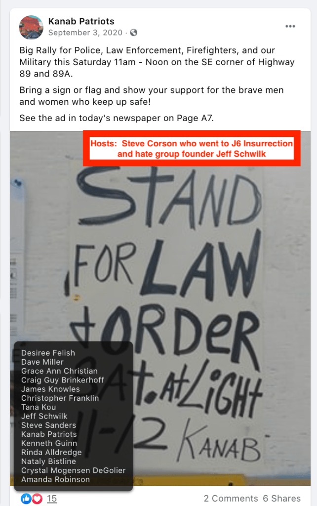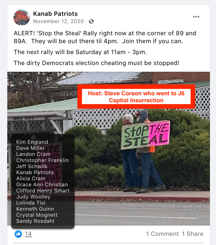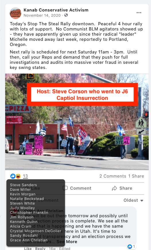 - Stephen Corson: went to insurrection and continues rallies to this day in Kanab with social media support from law enforcement Colton Cram
