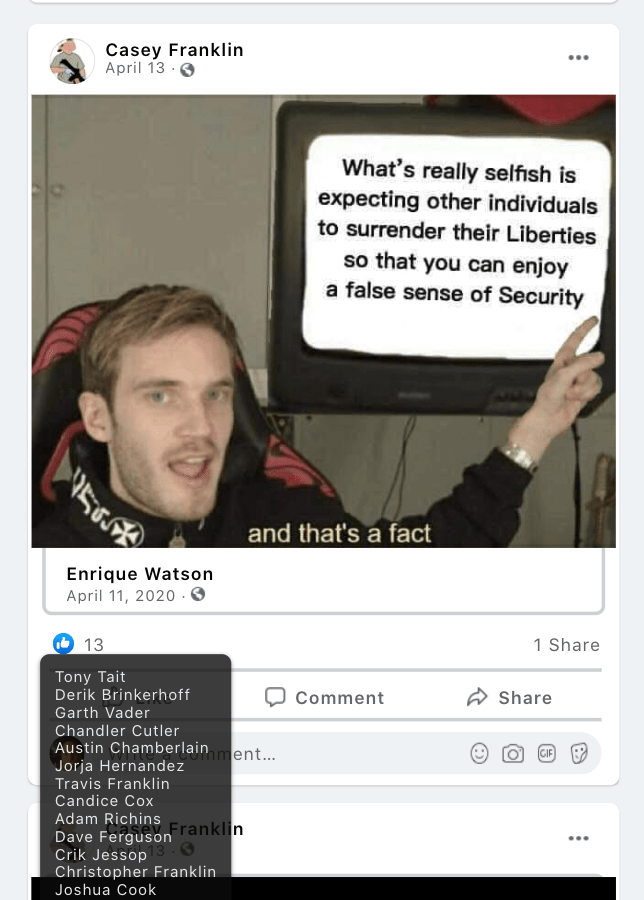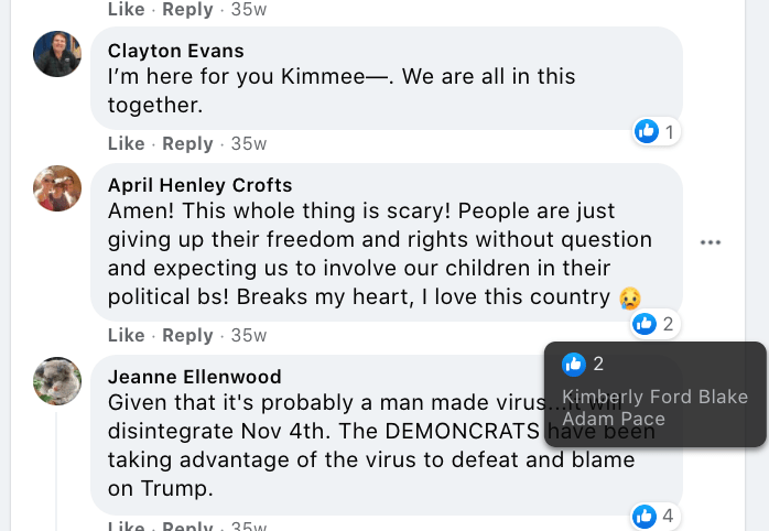 April implies that the pandemic is political, that public health regulations are giving up rights, and promotes spread of covid misinformation (cure, kids cannot transmit, suicide rate increase).