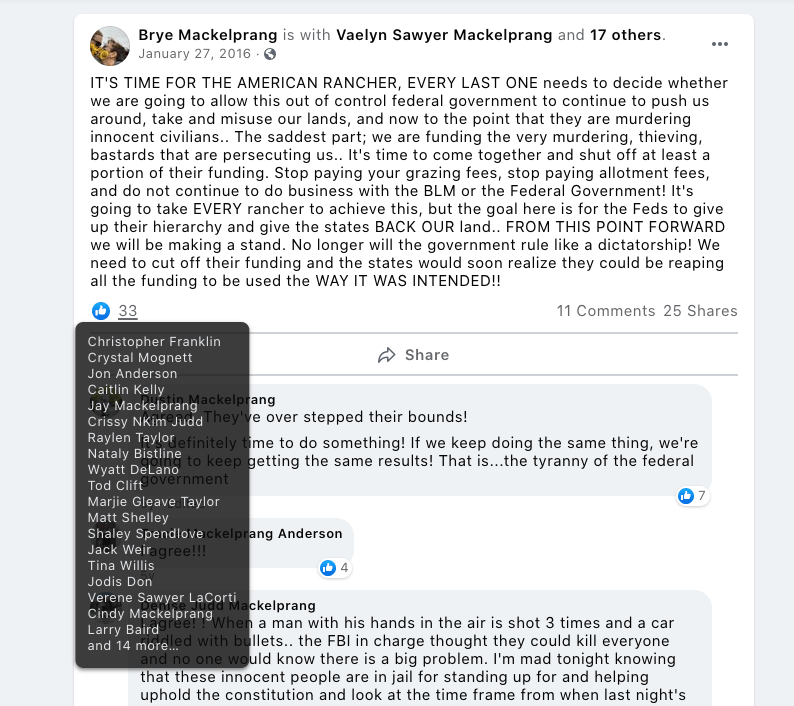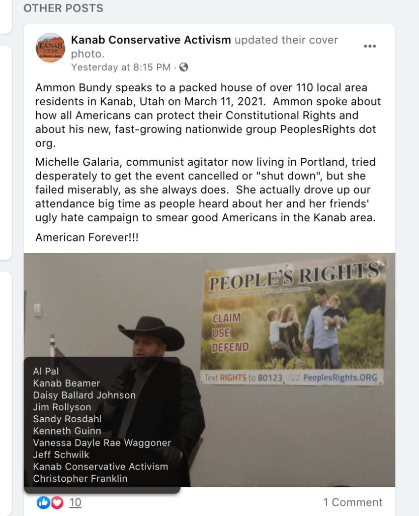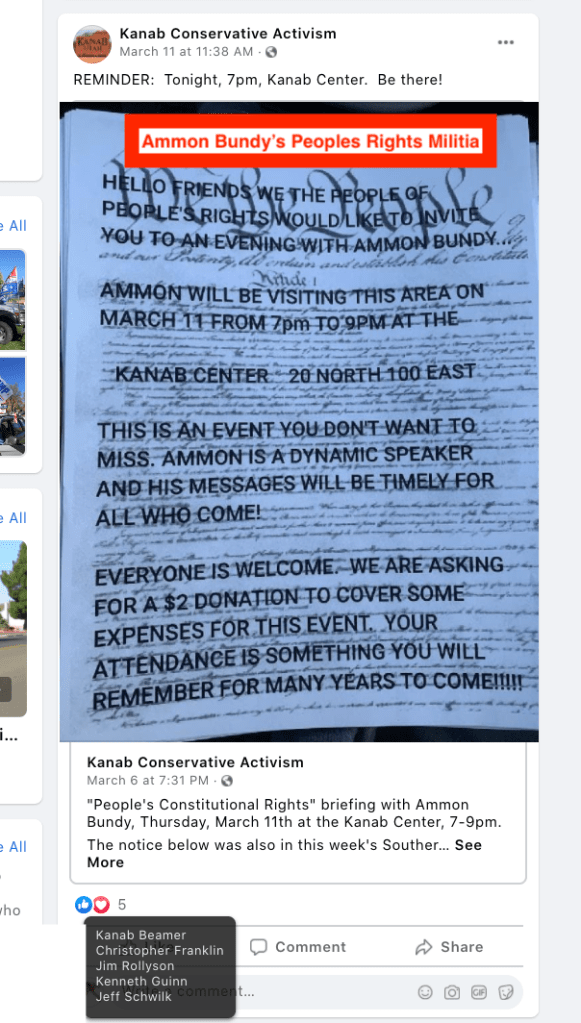 - Promote Ammon Bundy’s recruitment in Kanab for his Anti-Government People’s Rights Militia.