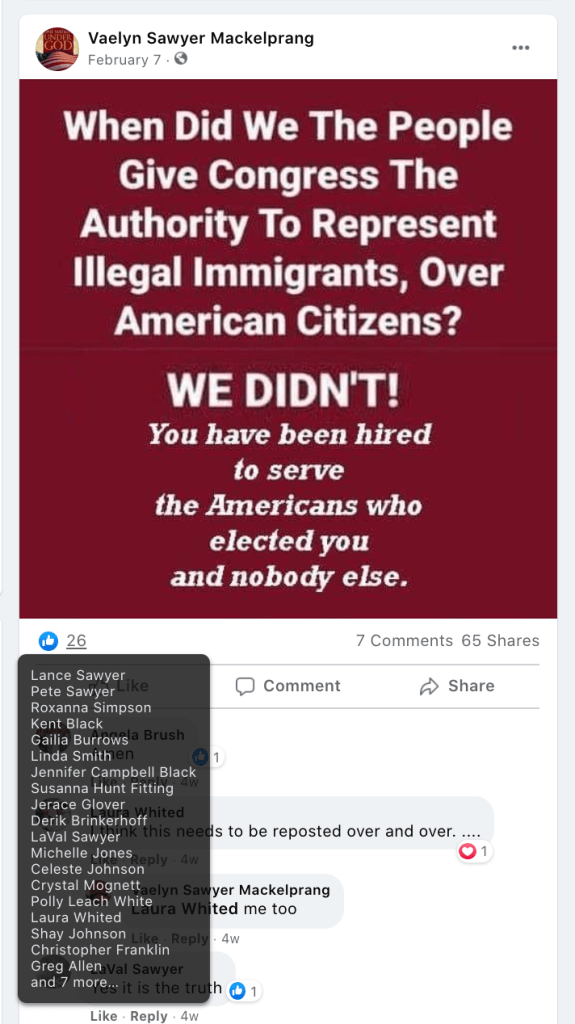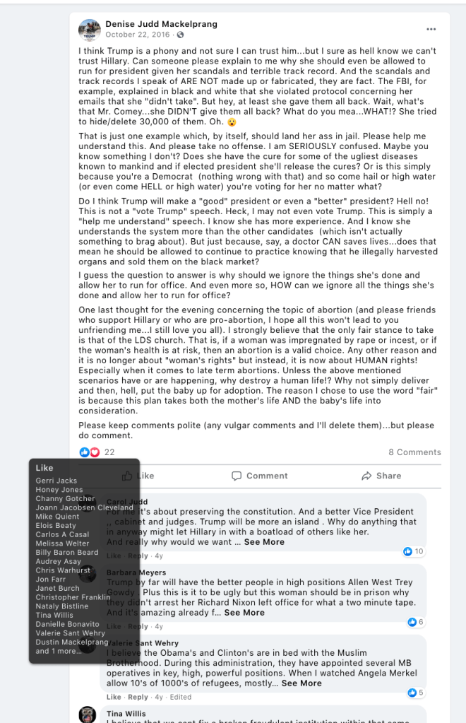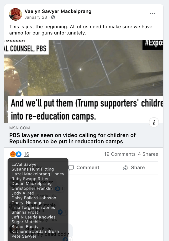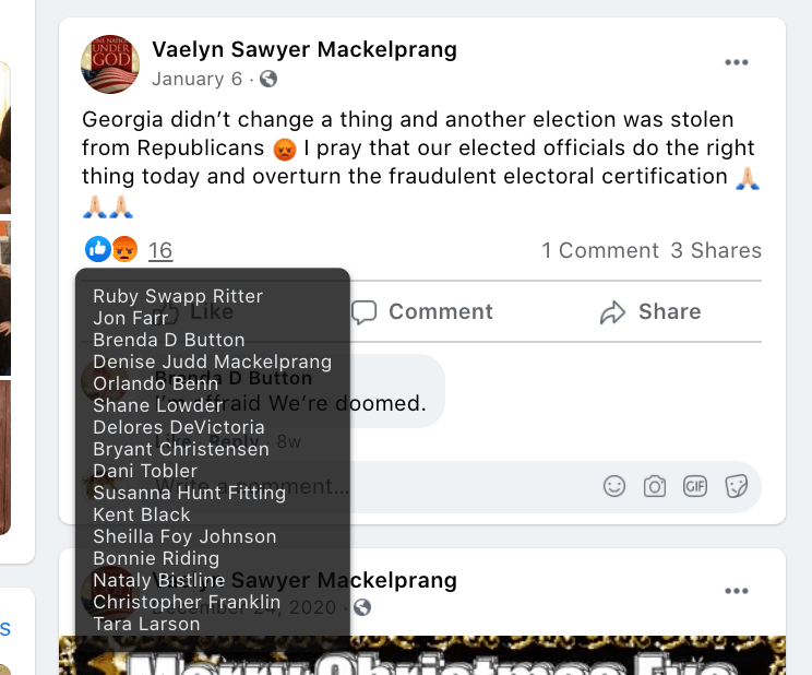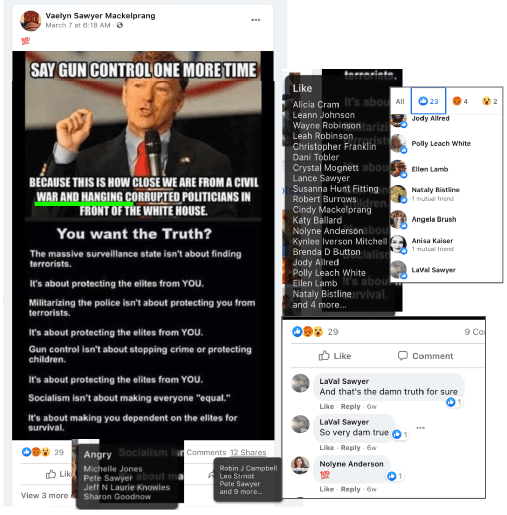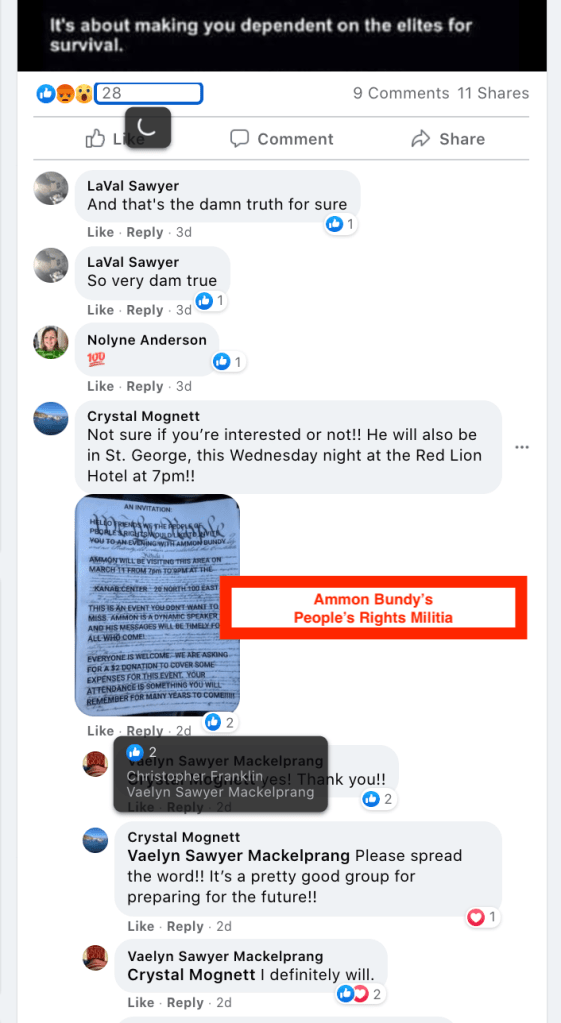 - Vaelyn Sawyer Mackelprang: significant extremism from St. George with many area followers. Multiple calls to fight: schools, hang politicians in front of White House…and conspiracy theories including reprogram concentration camps for conservatives