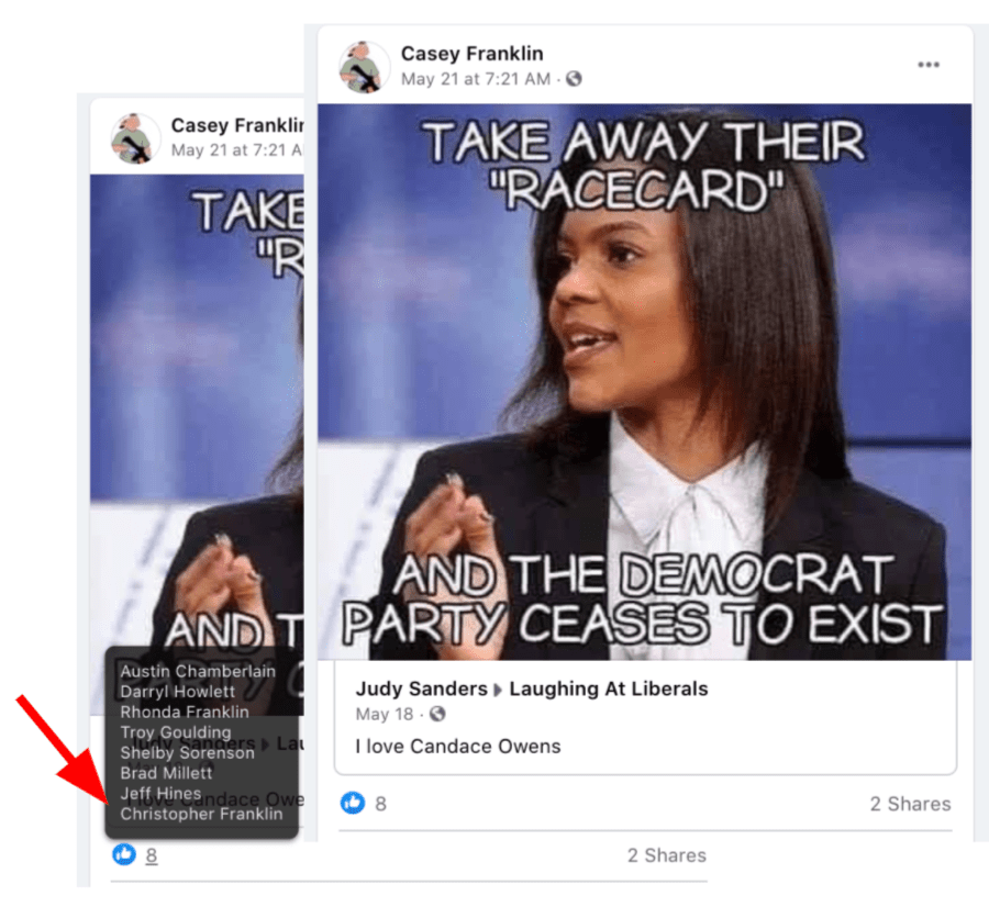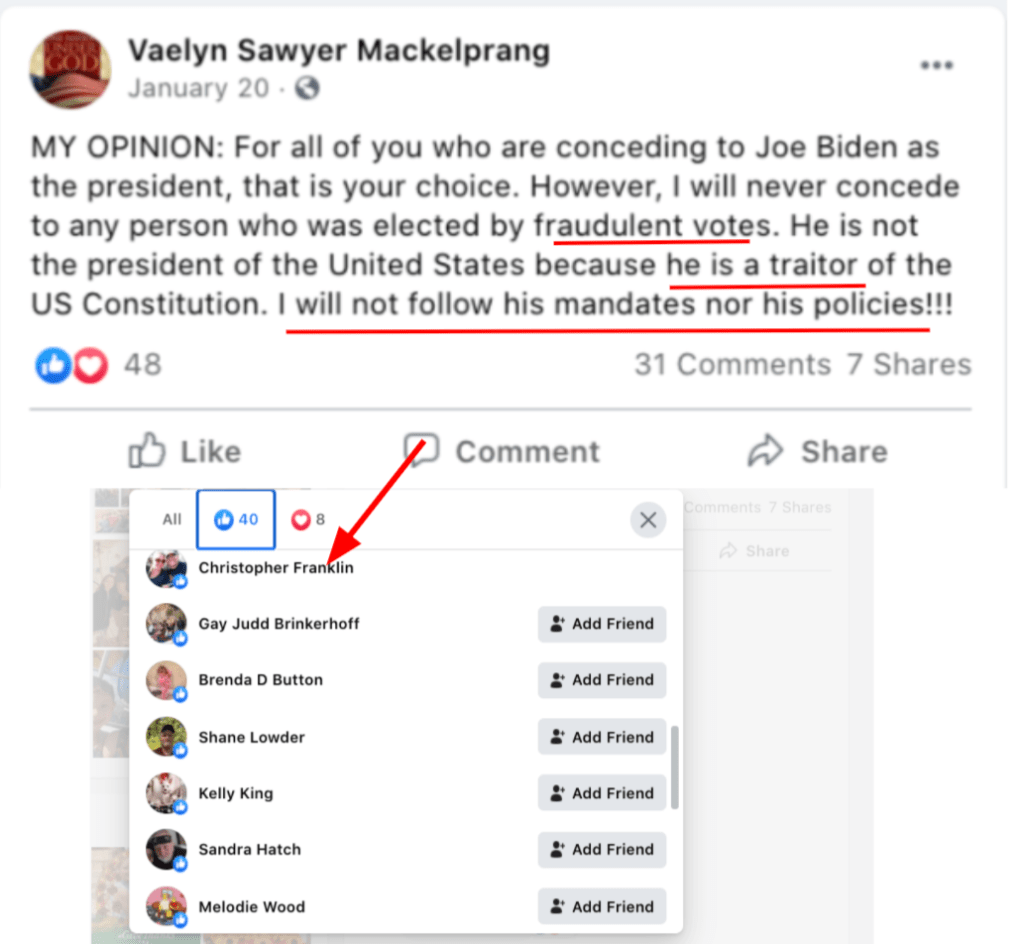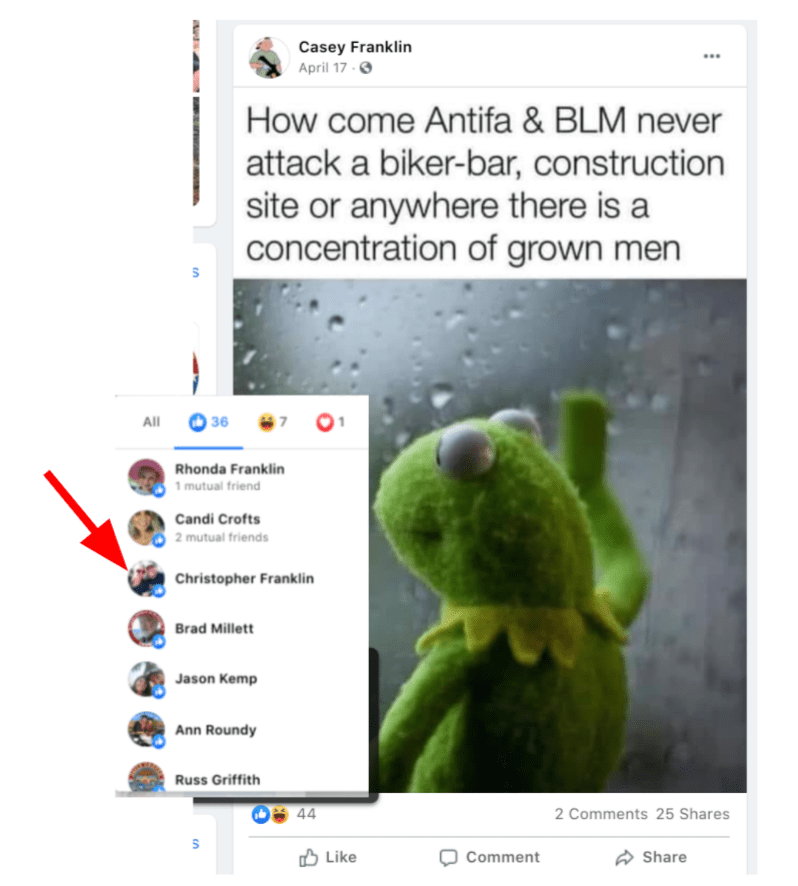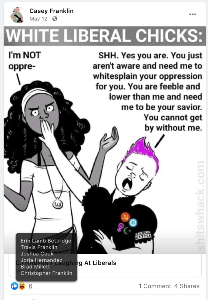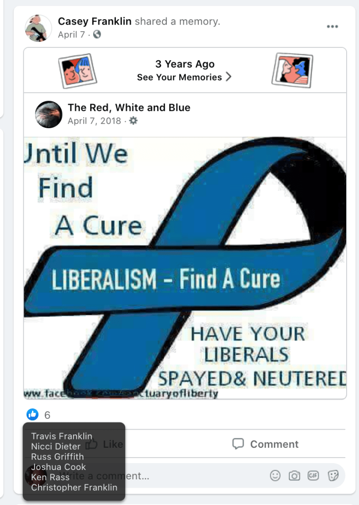 - list of evidence of other people who Franklin supports posts of extremism or bigotry