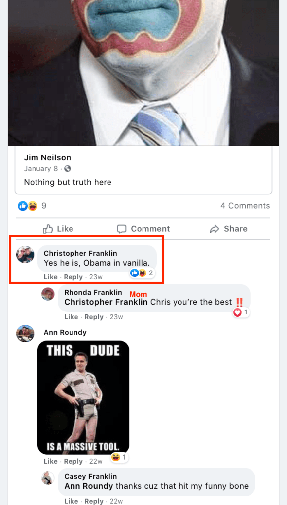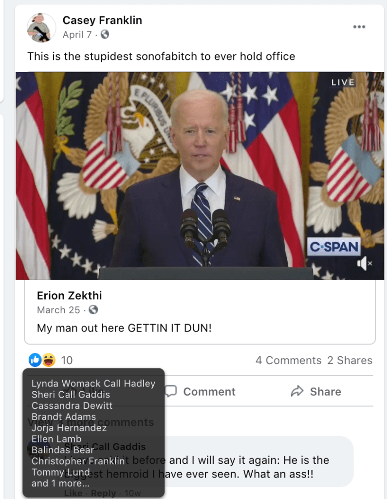 These images of Franklin’s public, online extremism and bigotry does not feature clickable links, see slideshow above or paragraphs below for links.